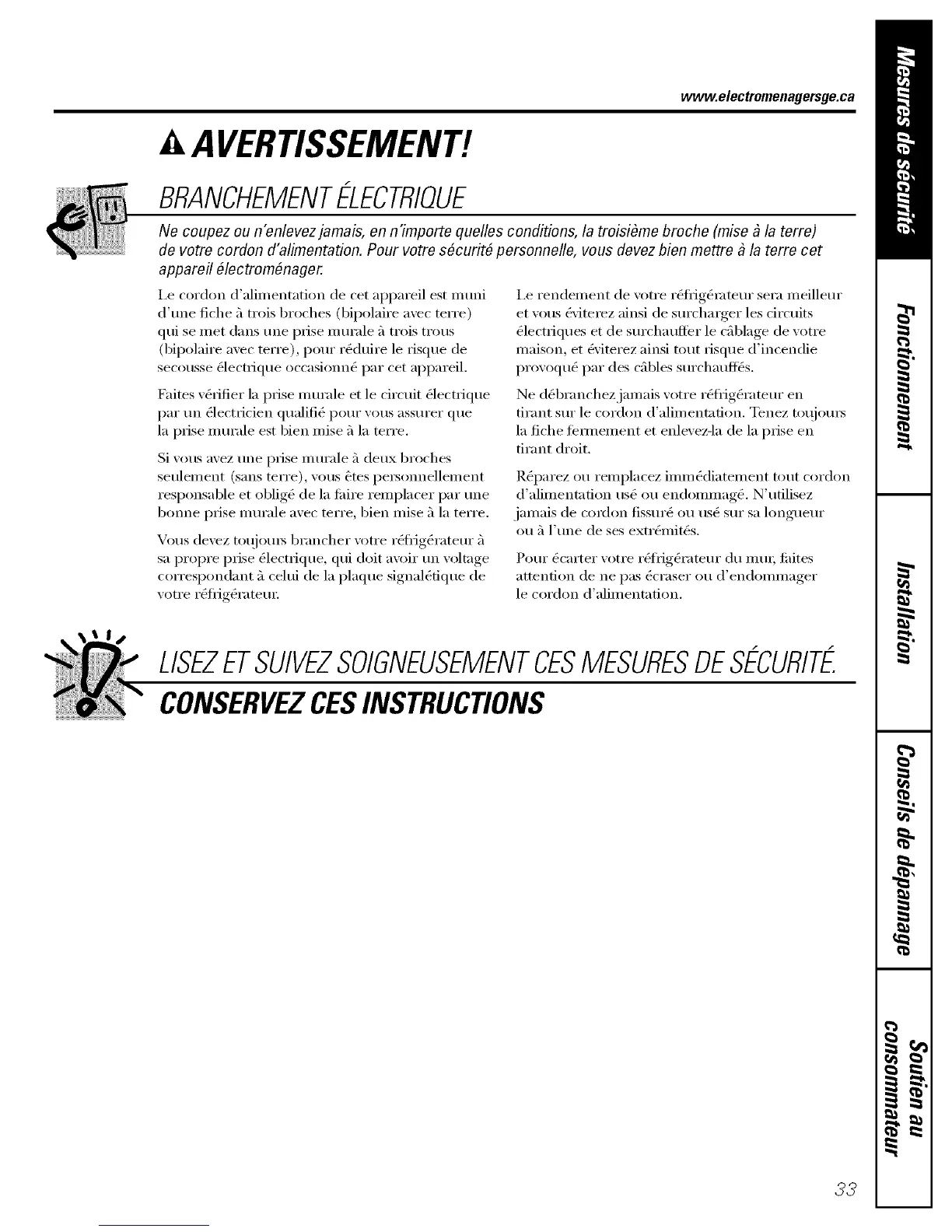 de votre cordon d'alimentation. Pour votre s#curit# personnelle, vous devez bien mettre _ la terre cet