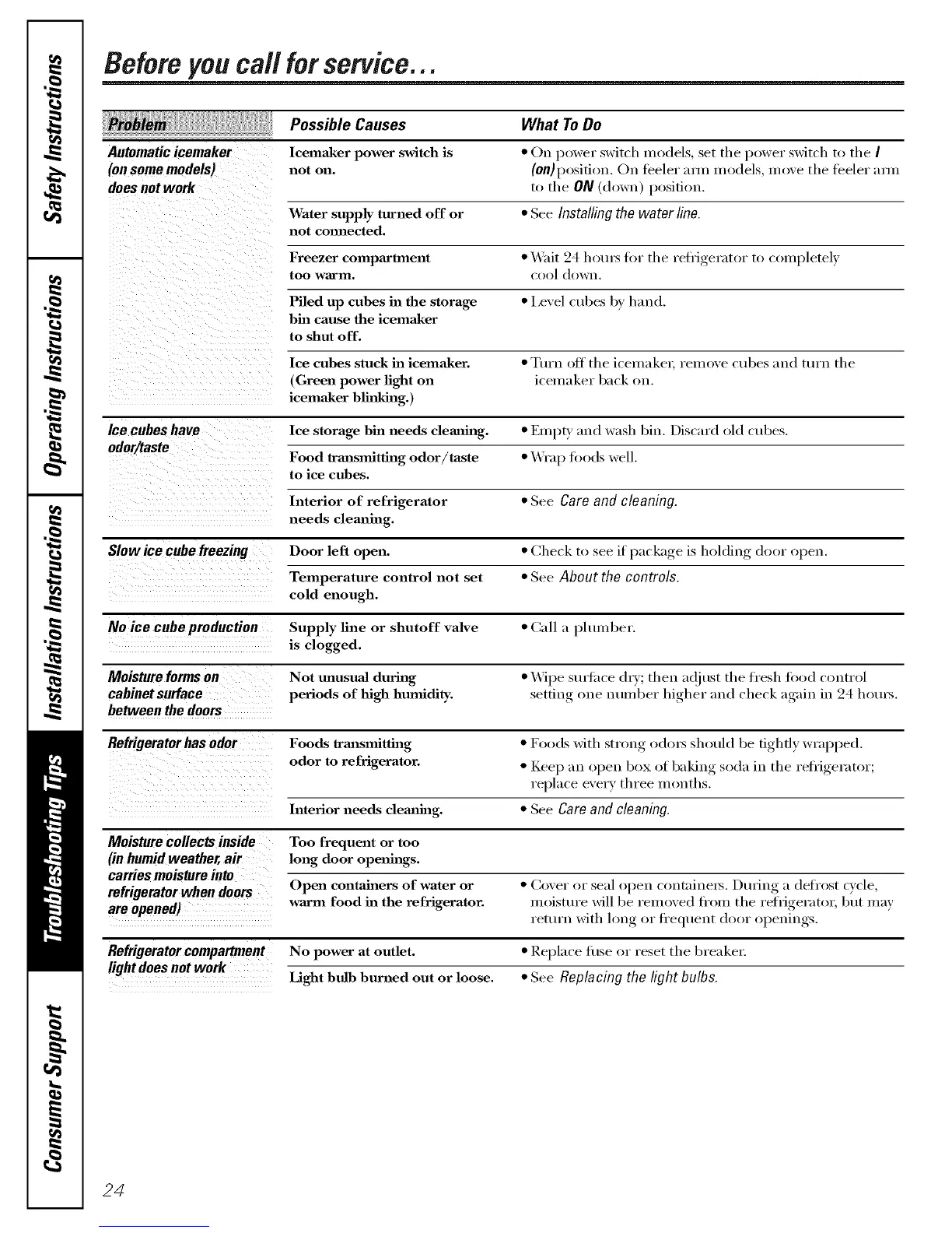 No ice cube production Supply fine or shutoff valve • Call a phunber.