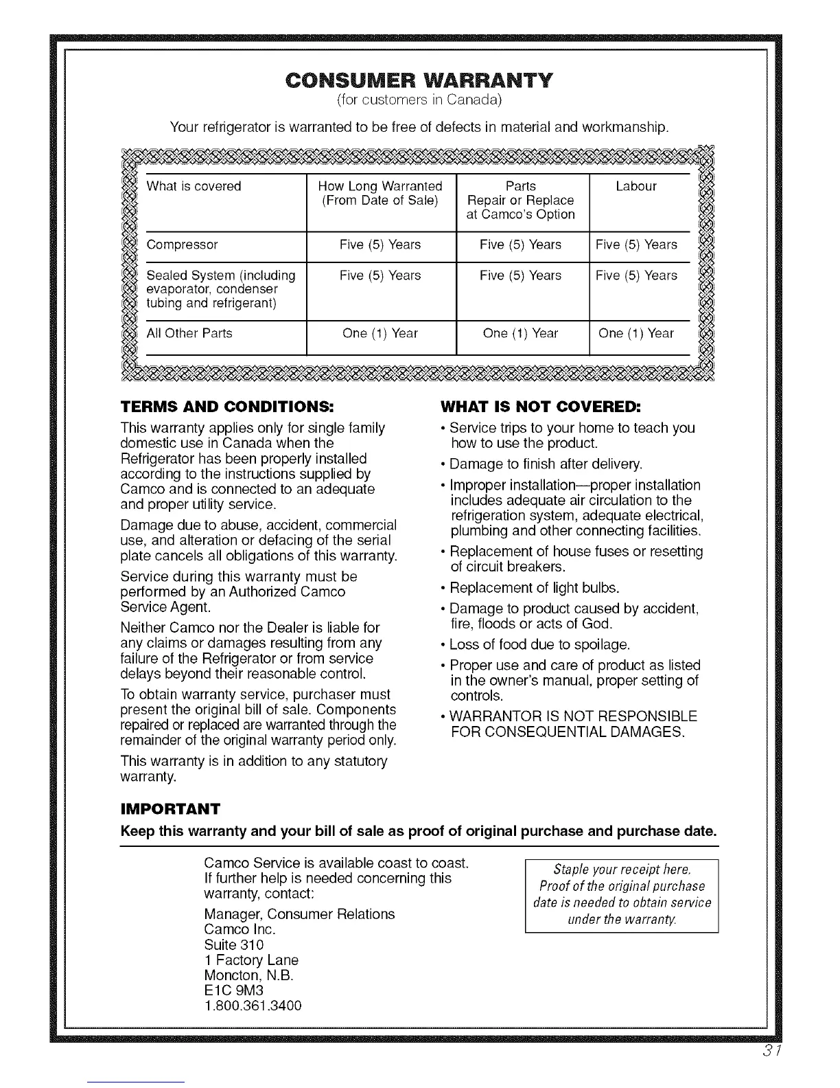 Your refrigerator is warranted to be free of defects in material and workmanship.