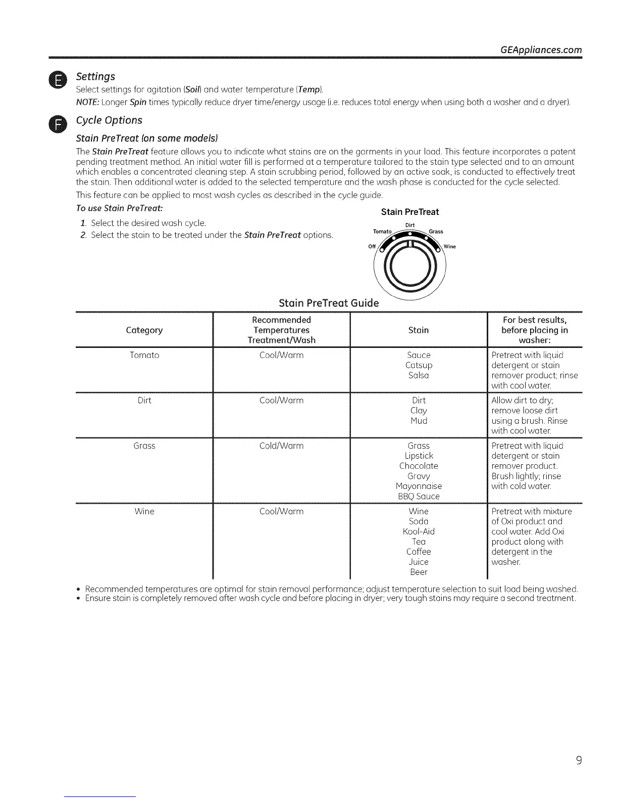 • Recommended temperatures are optimal for stain removal performance; adjust temperature selection to suit load being washed.