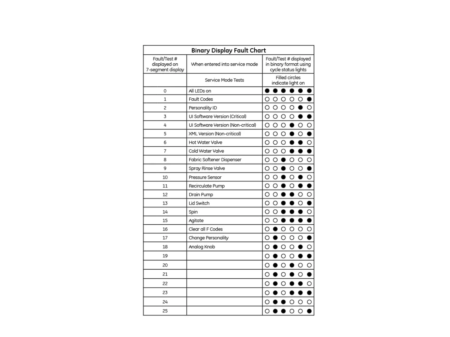 GE GTW460ASJWW - Binary Display Test and Fault Chart