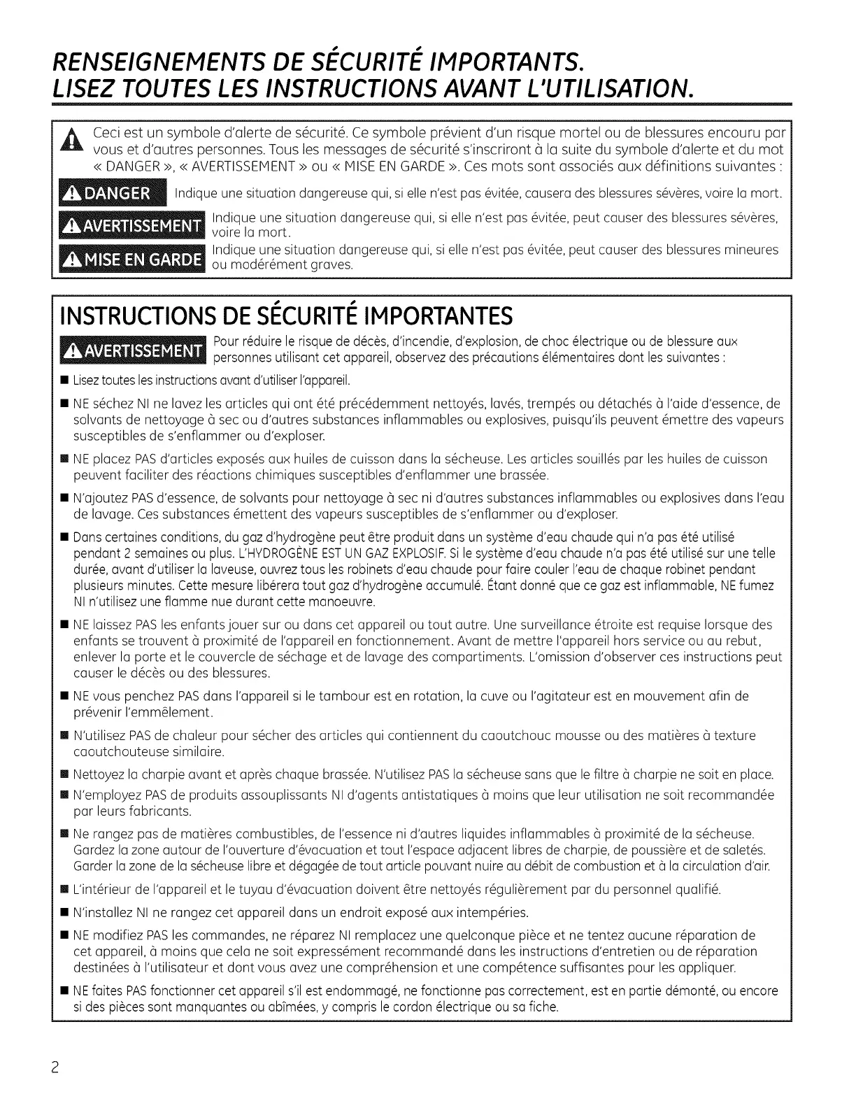 • NE s6chez NI ne lavez les articles qui ont 6t6 pr6c6demment nettoy6s, lav6s, tremp6s ou d@ach6s 6 I'aide d'essence, de