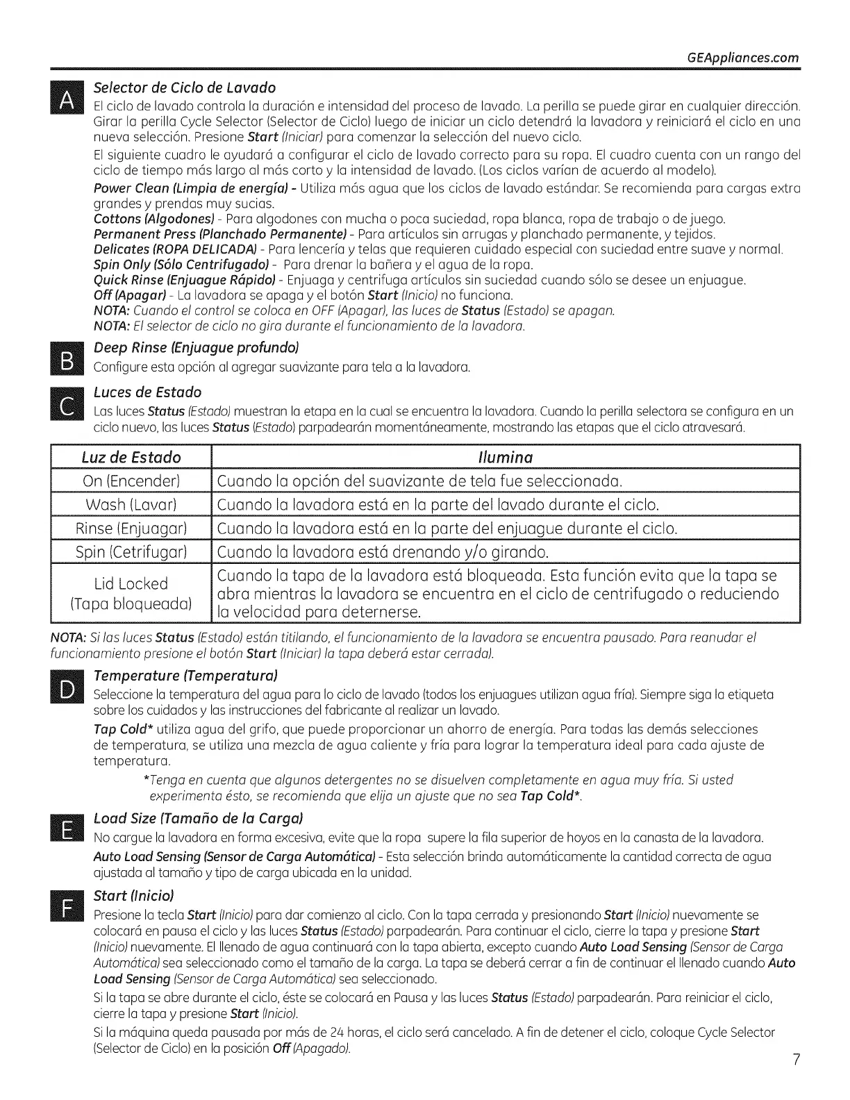 (Inicio)nuevamente. ElIlenado de agua continuar6 con la tapa abierta, excepto cuando Auto Load Sensing (Sensor de Cargo