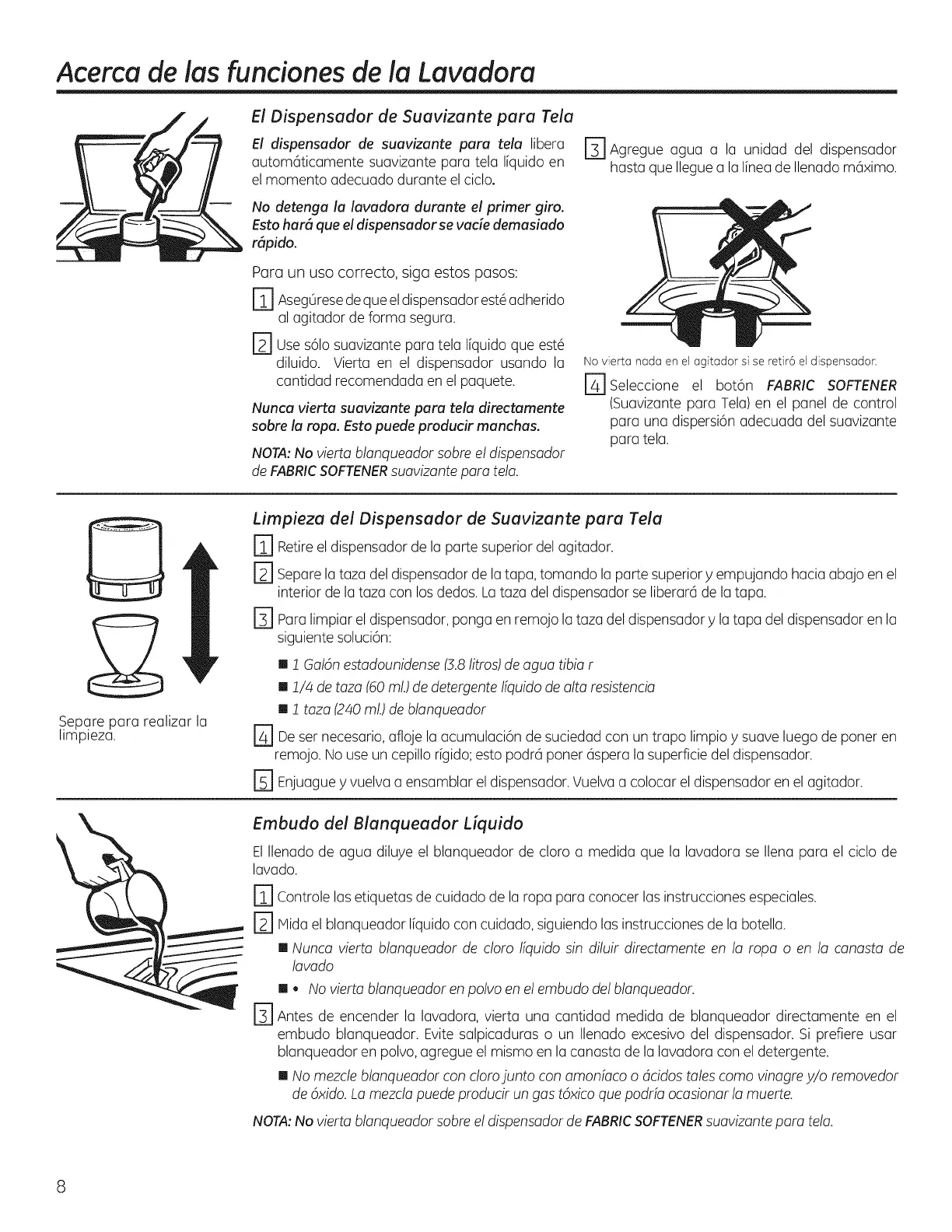 embudo blanqueador. Evite salpicaduras o un Ilenado excesivo del dispensador. Si prefiere usar