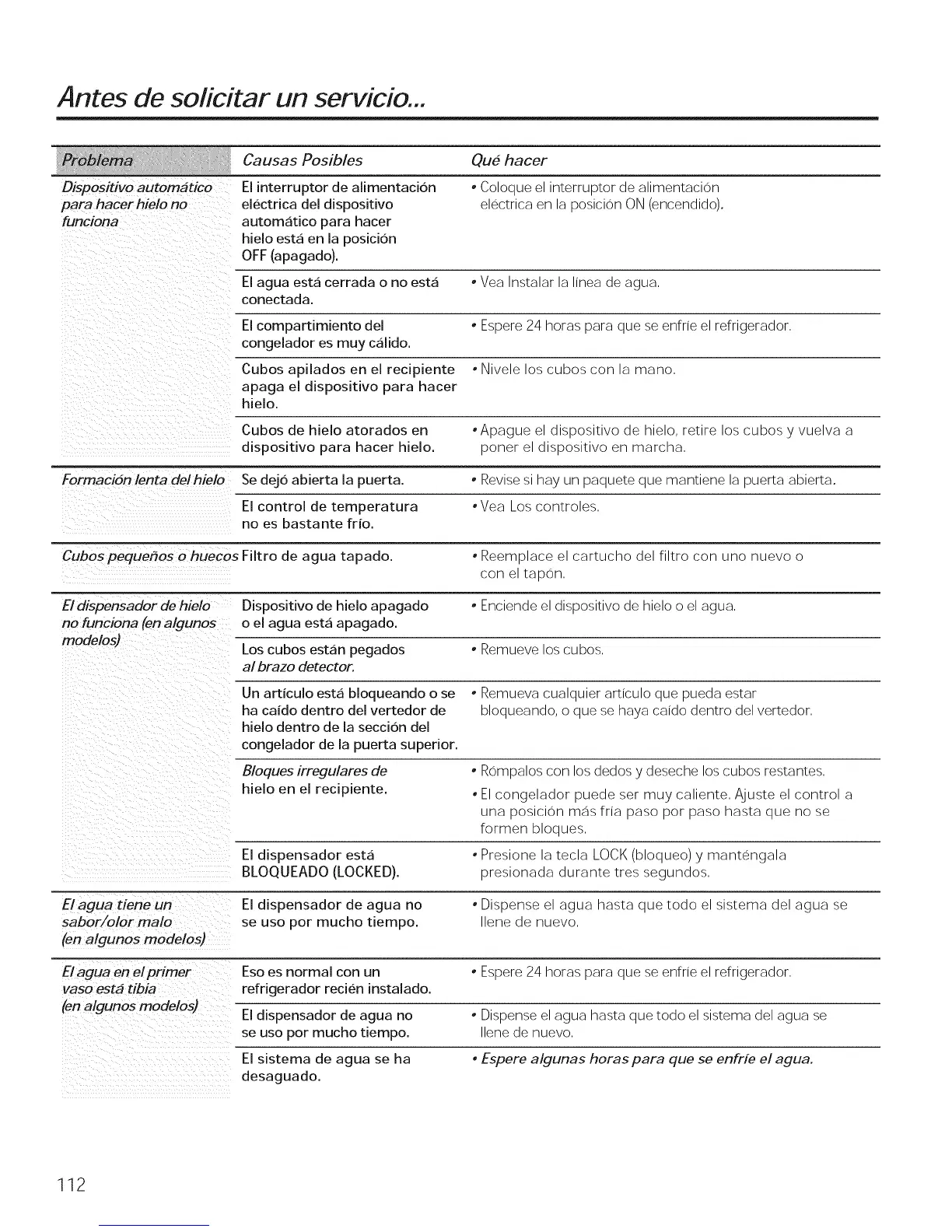 Elagua tiene un El dispensador de agua no • Dispense el agua hasta que todo el sistema del agua se