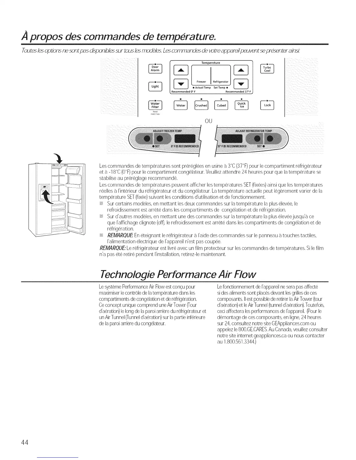 Lescommandes de temperatures sont prer6gl6es en usineh 3°C (37°F)pour le compartiment reffig6rateur