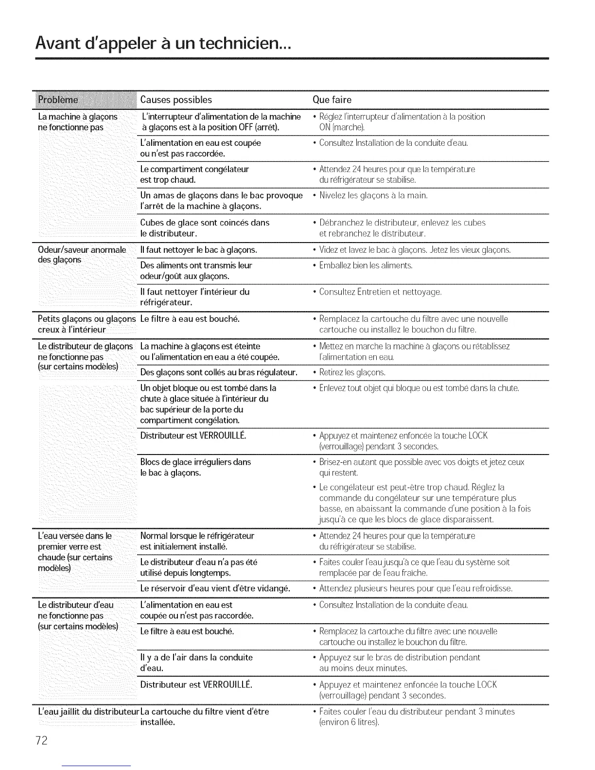 Odeur/saveur anormale II faut nettoyer le bac a glaqons. • Videzet lavez le bac _ glaqons. Jetez les vieux glaqons.