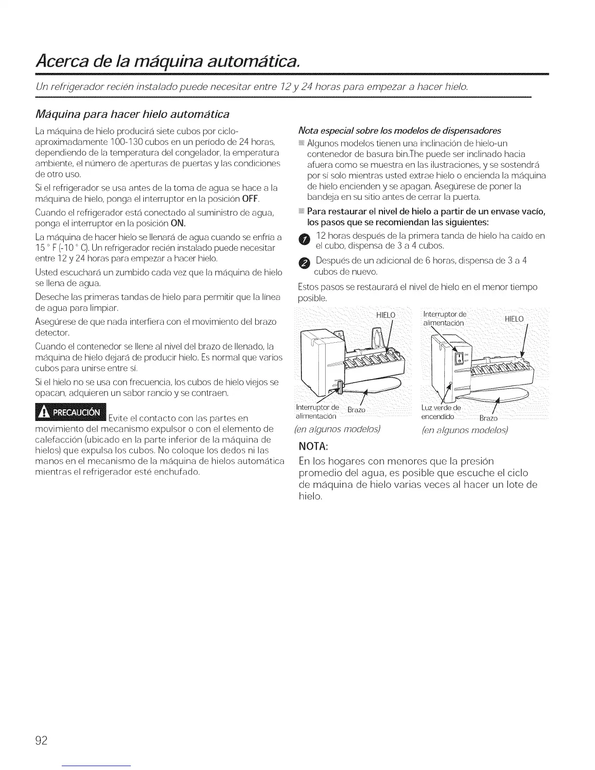 Un refrigerador recien insta/ado puede necesitar entre 72y 24 horas para empezar a hacer hielo.