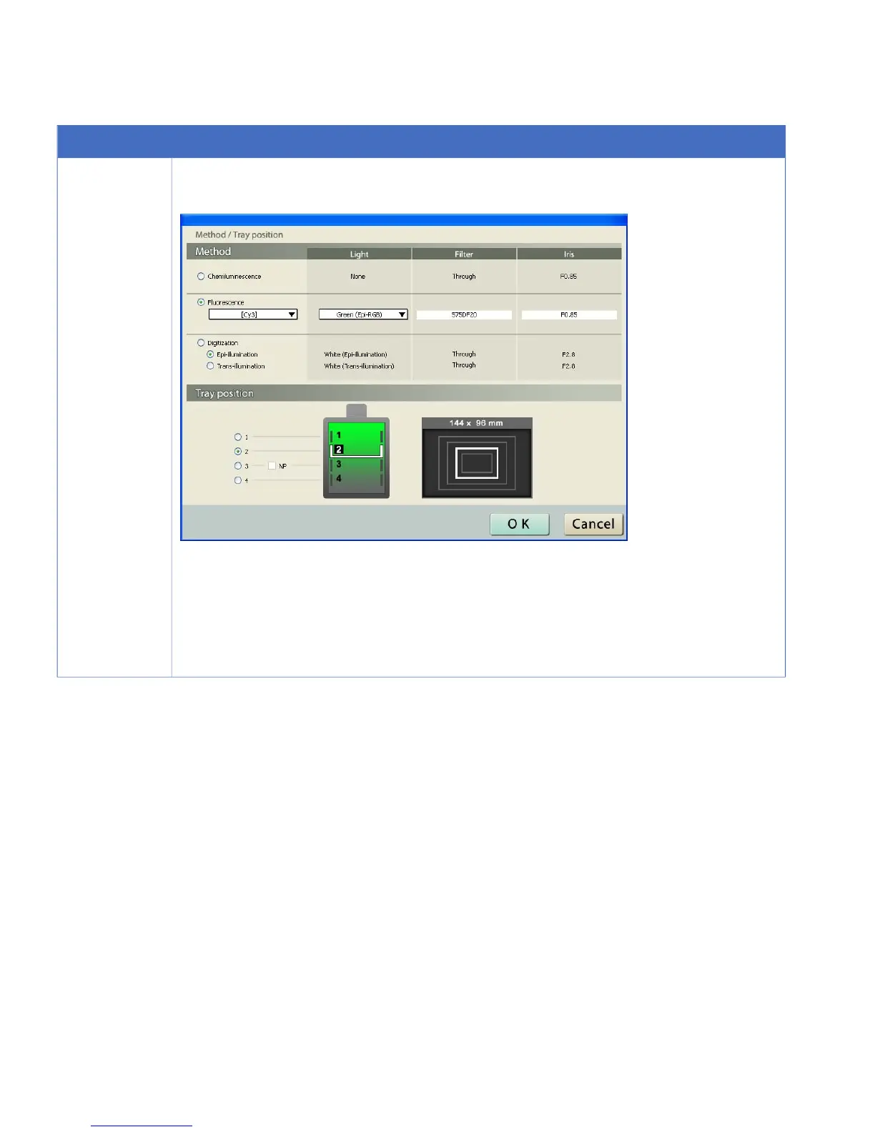 Result: The Method/Tray position dialog opens.