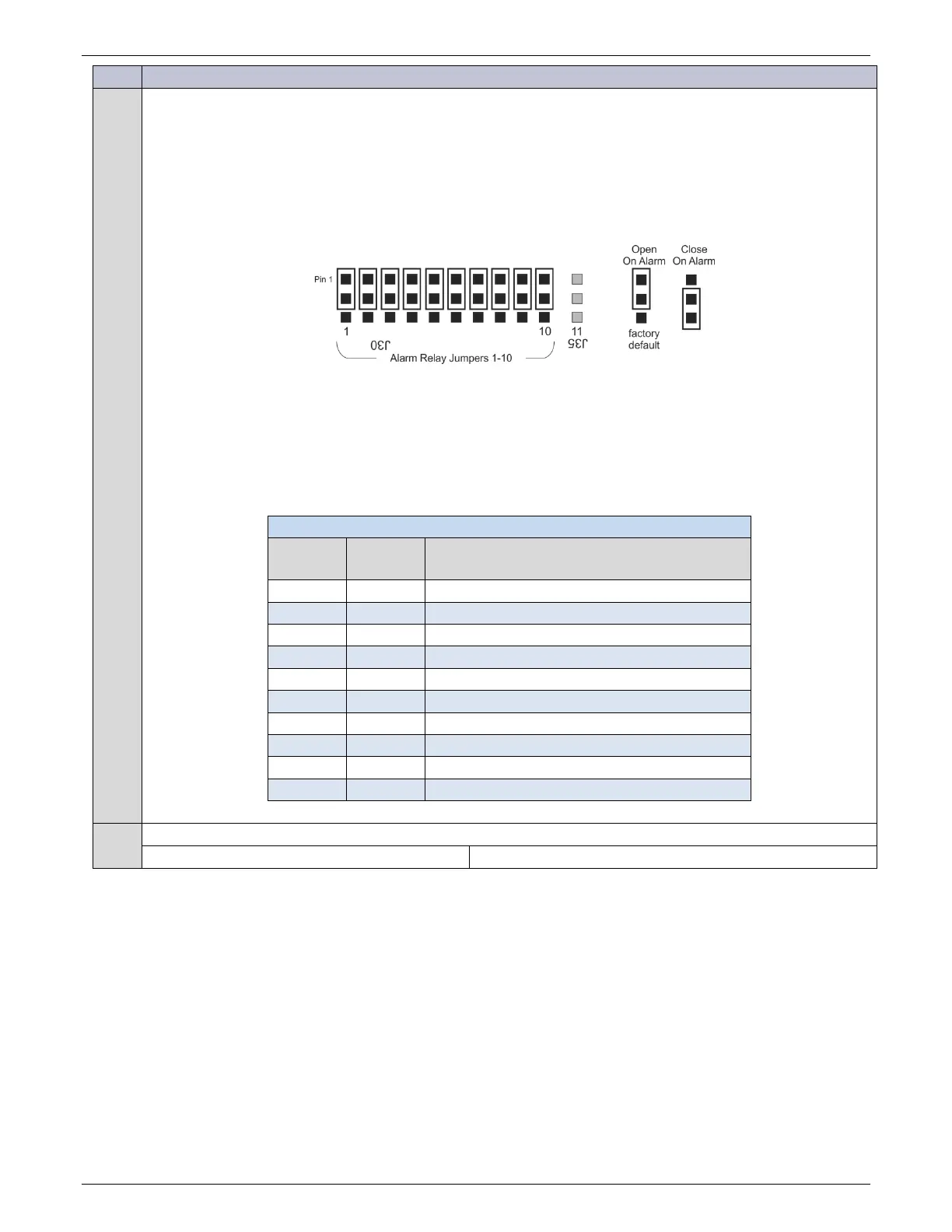Each Alarm Relay Jumper select “Open On Alarm” or “Closed On Alarm” for one alarm signal and each signal
