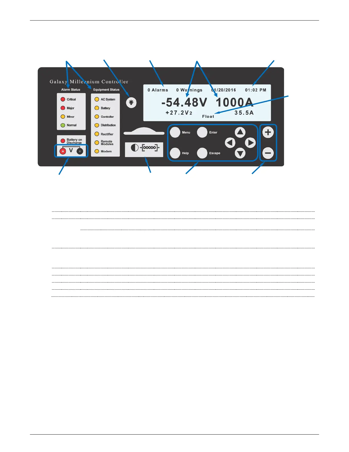 The Millennium II controller’s primary user interface is the front panel, which includes a backlit LCD, and an array of