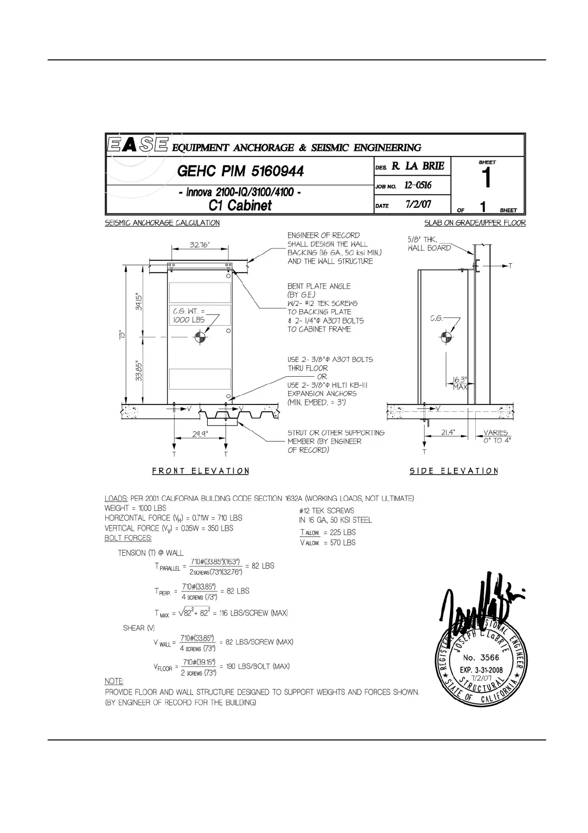 GE Innova 3100 - 2.1 C1 Cabinet - Slab on Grade; Upper Floor