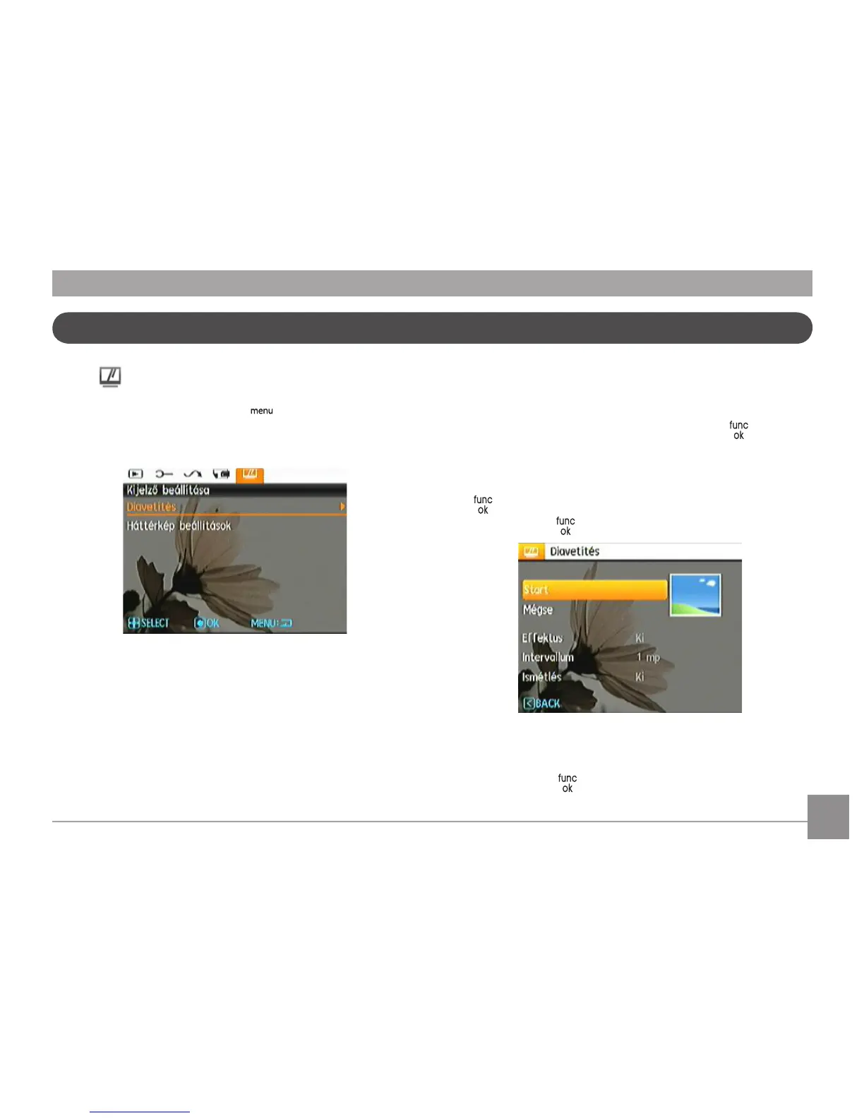 1. Válassza ki a Diavetítés menüt, nyomja meg a vagy