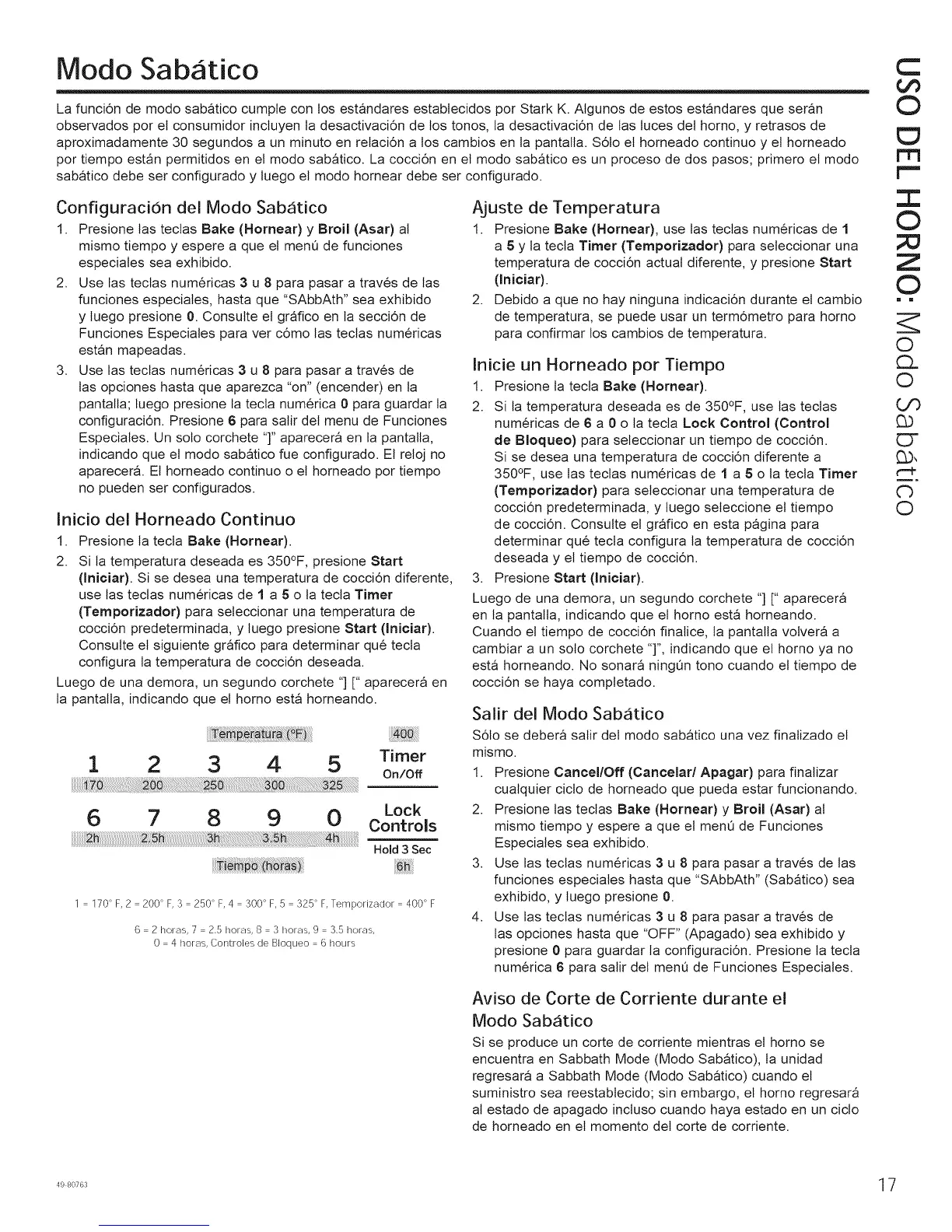 1 = 170" F, 2 = 200 ° F, 3 = 250" F, 4 = 300 ° F, 5 = 325" F, Temporizador = 400 ° F