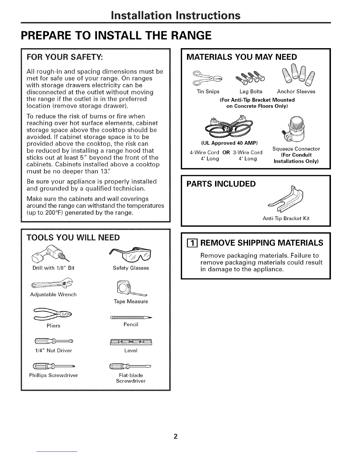 PREPARE TO INSTALL THE RANGE