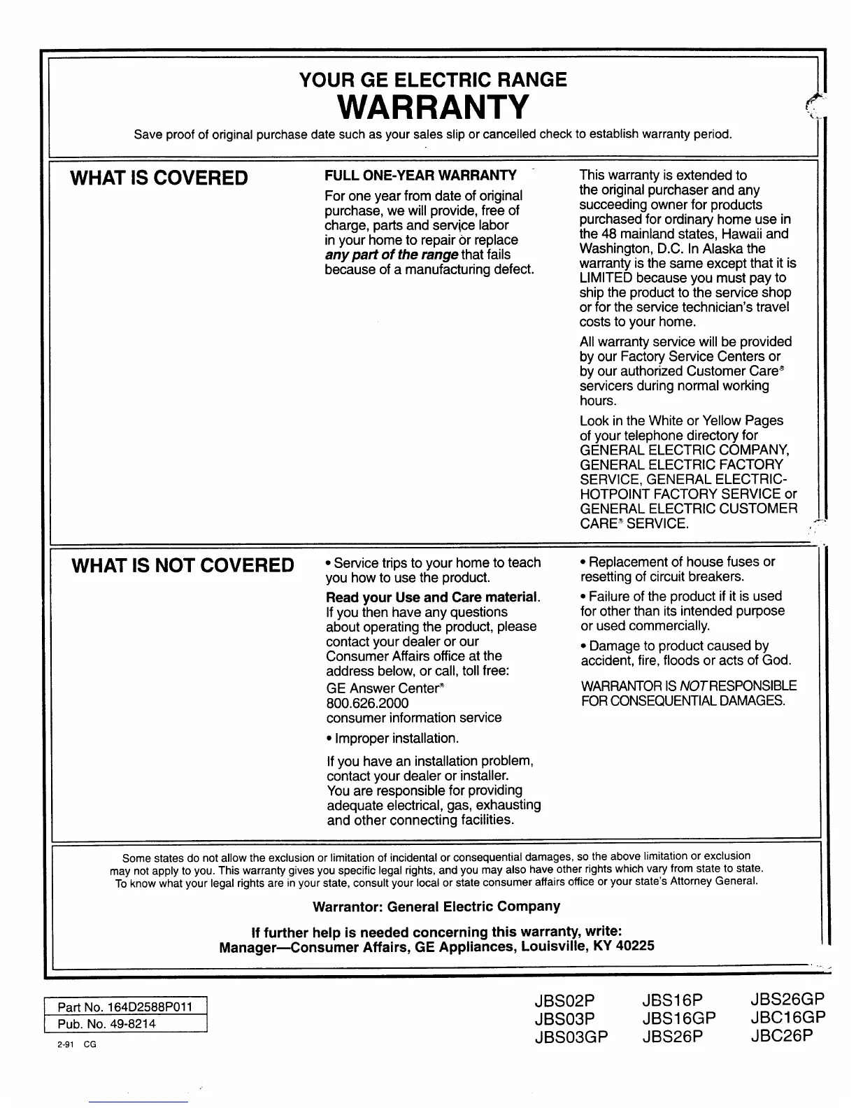 Save proof of original purchase date such as your sales slip or cancelled check to establish warranty period.