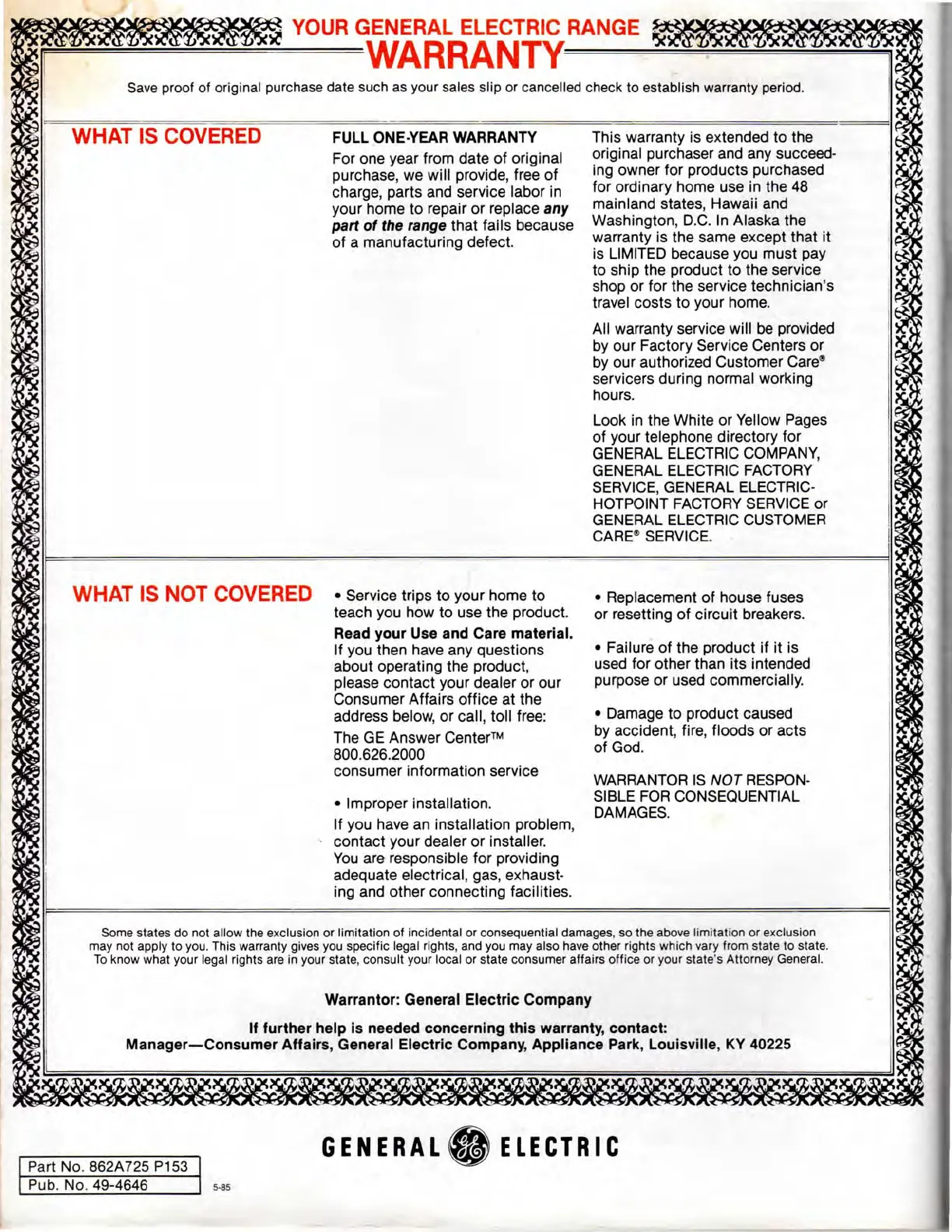 proof of original purchase date such as your sales slip or cancelled check to establish warranty period.