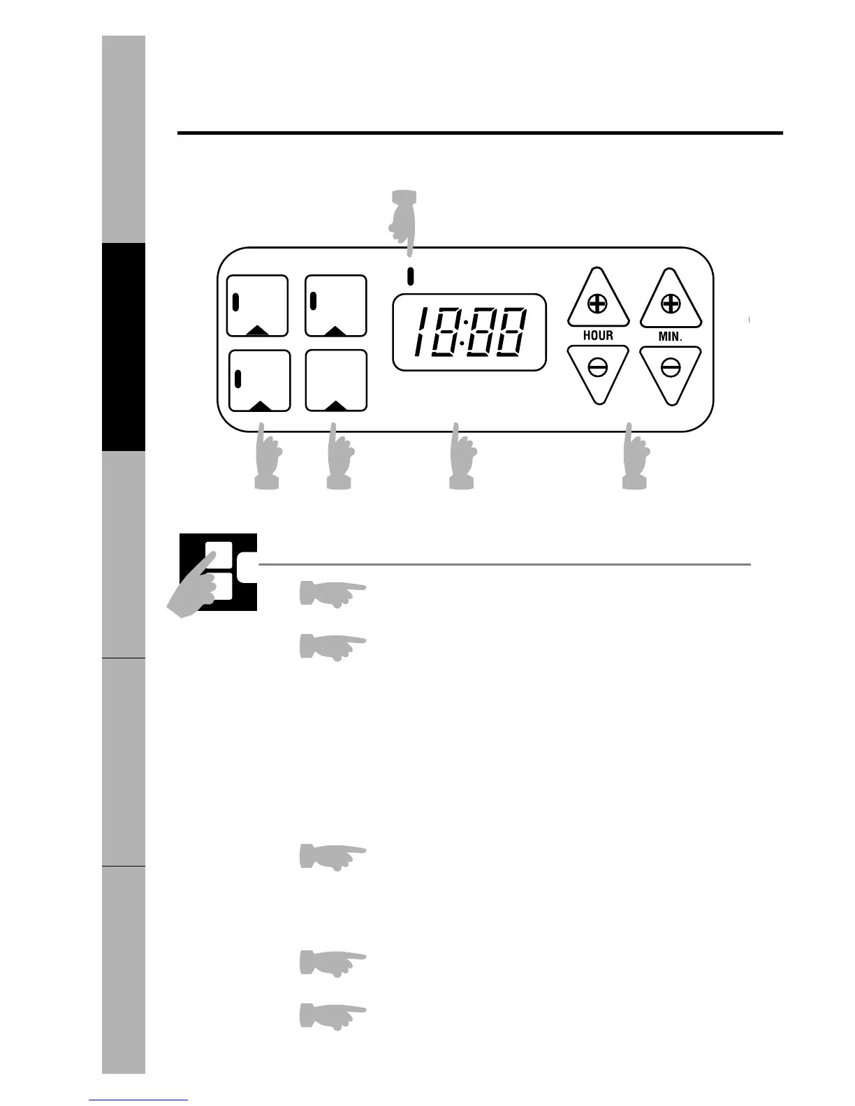 Press this pad and the HOUR and MIN. pads to delay