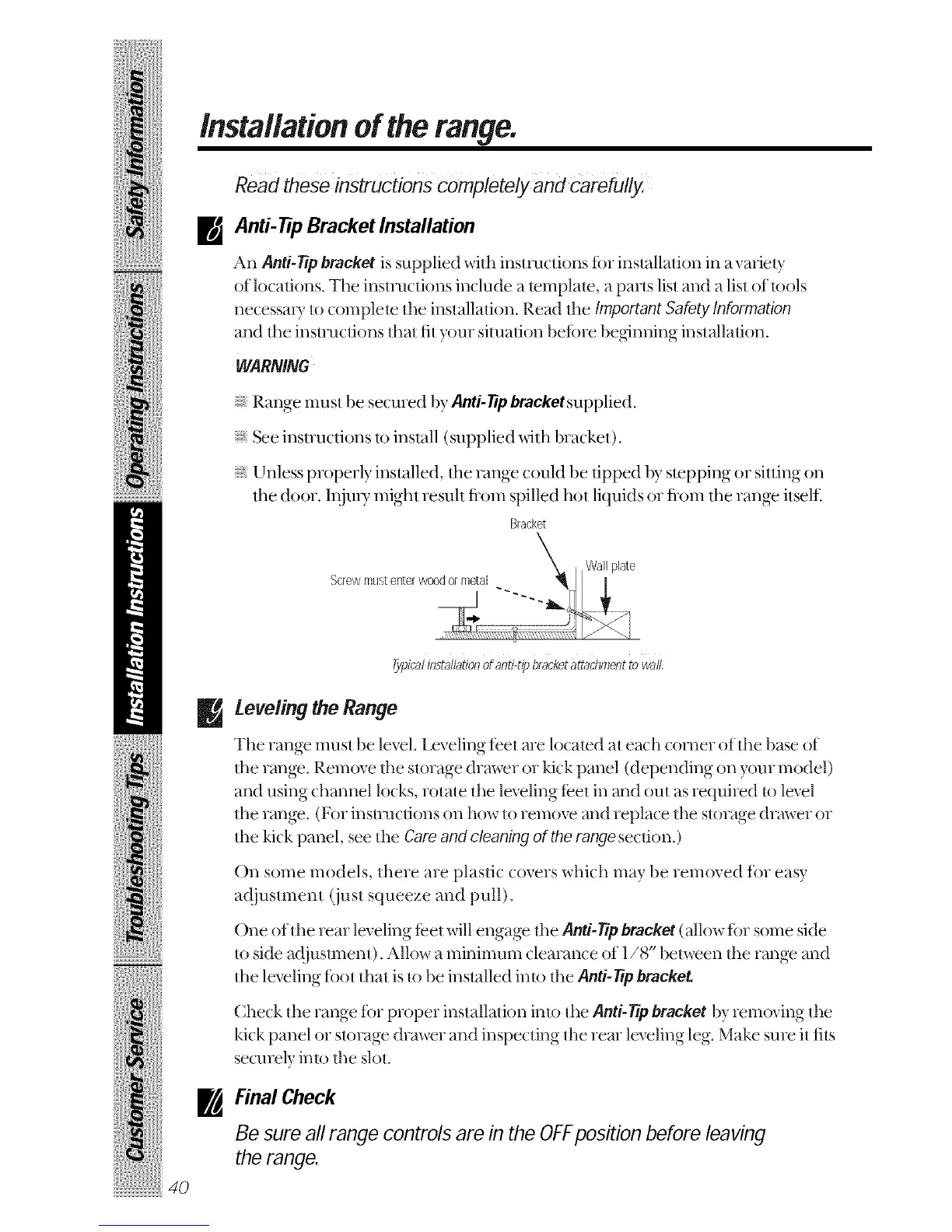 to side adjustment). Allow a minimum clearance of 1/8" betsveen the range and