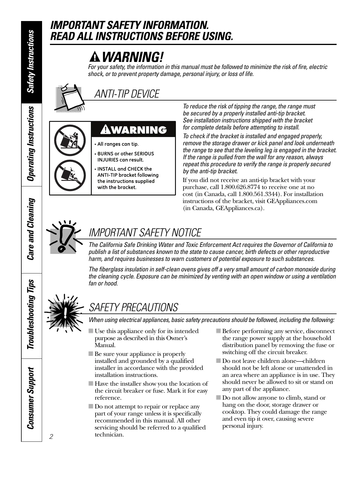 Consumer Support Troubleshooting Tips Care and Cleaning Operating Instructions Safety Instructions