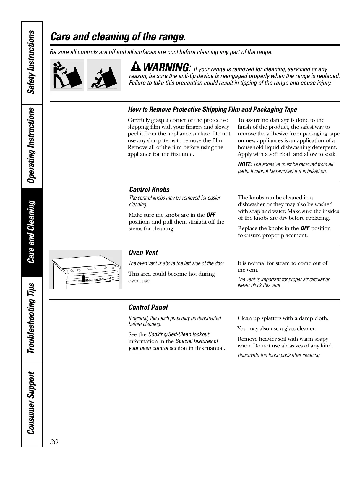 Be sure all controls are off and all surfaces are cool before cleaning any part of the range.