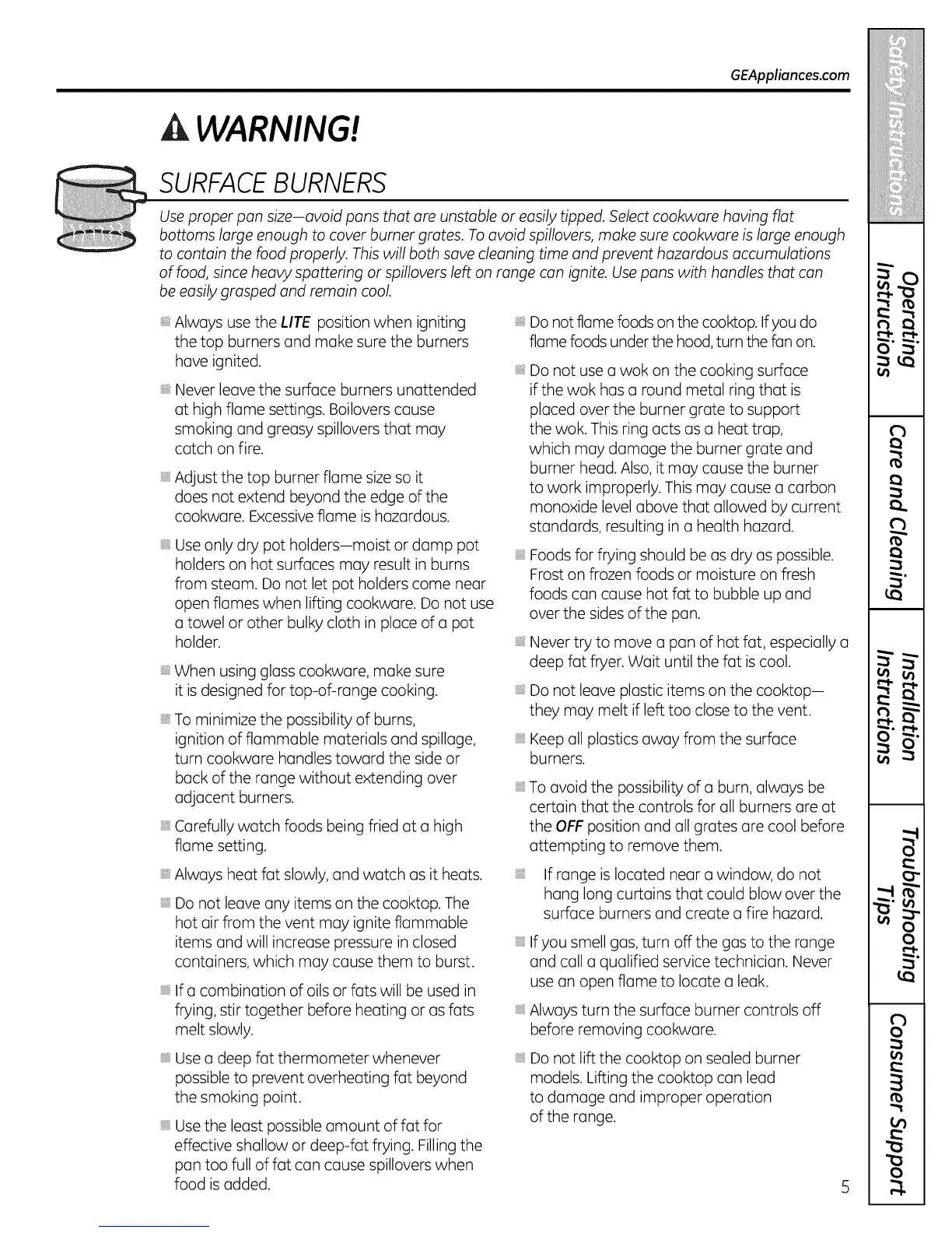 bottoms large enough to cover burner grates. To avoid spillovers, make sure cookware is large enough