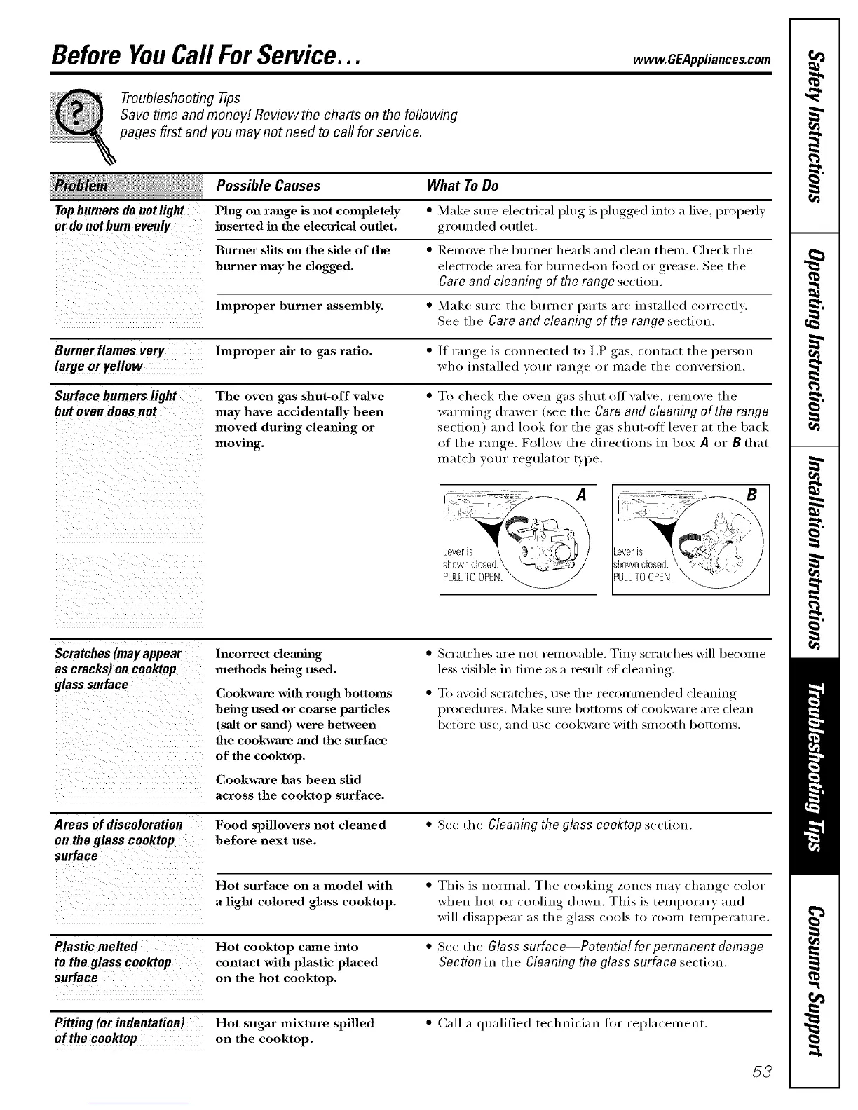 Topburners do notlight Plug on range is not completely • Make sure electrical plug is I)lugged into a live, properly