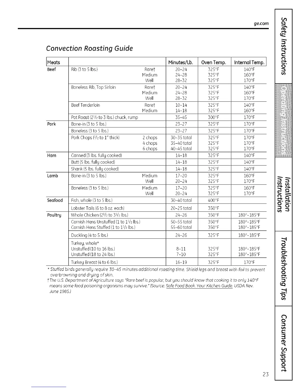 * Stuffed birds generally require 30-45 minutes additional roasting time. Shield legs and breast with foil to prevent