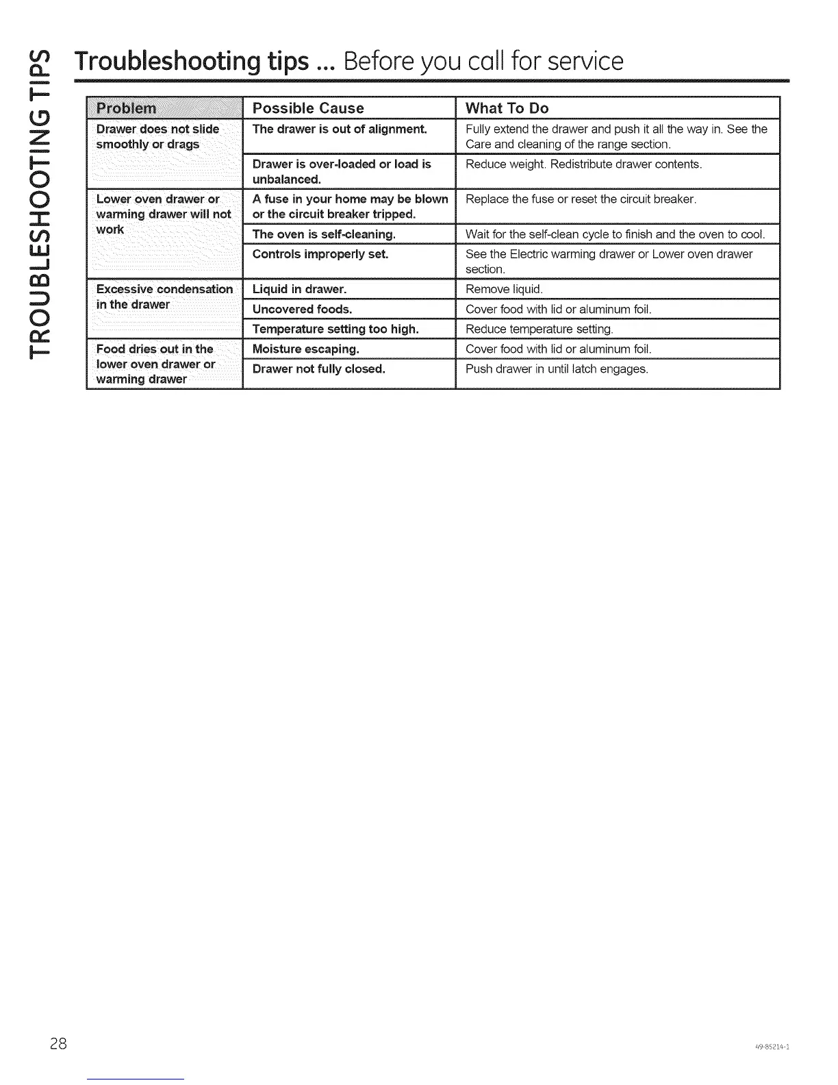 Drawer does not slide The drawer is out of alignment. Fully extend the drawer and push it all the way in. See the