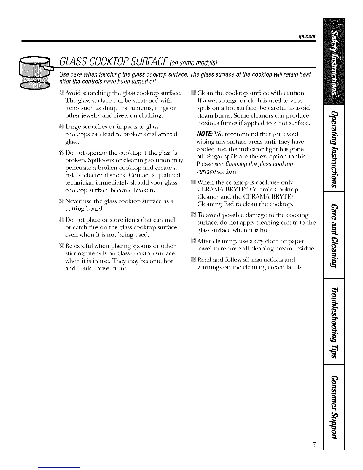 Use care when touching the glass cooktop surface. The glass surface of the cooktop will retain heat