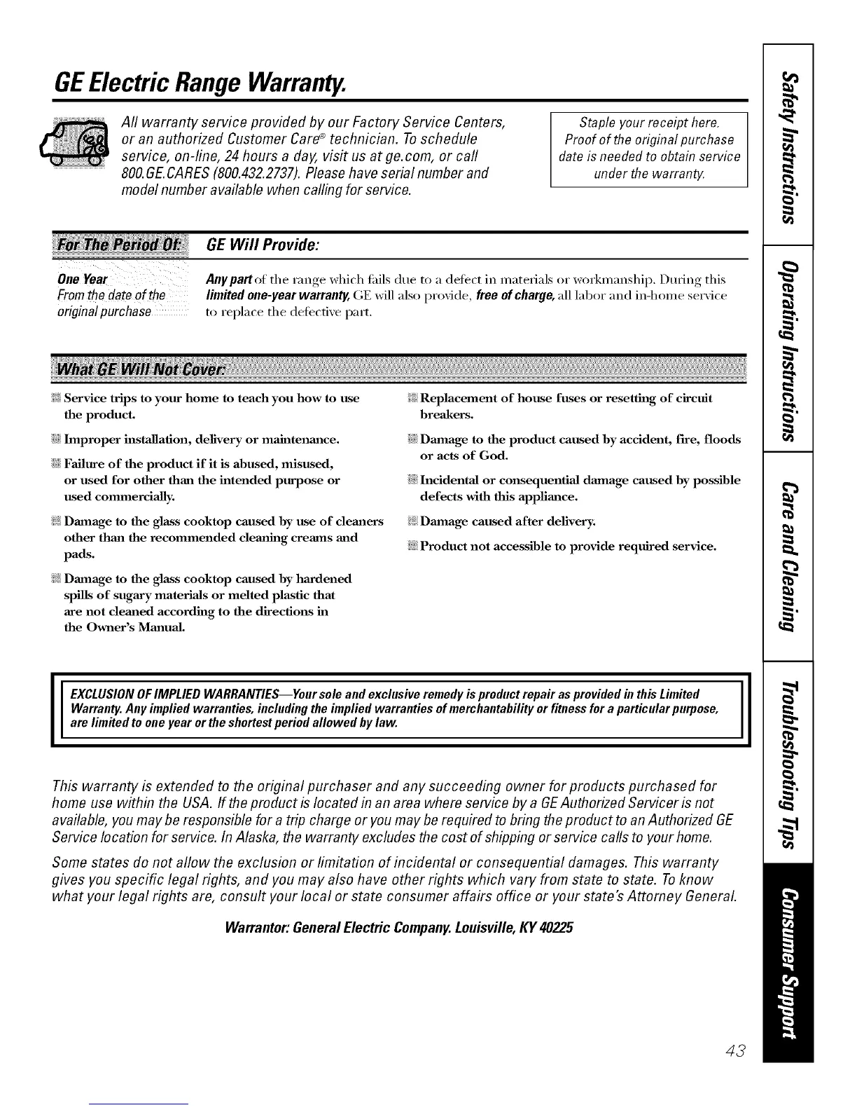 From the date of the limited one-year warranty, GE will also l)rovi(le, free of charge, all labor and in-home service
