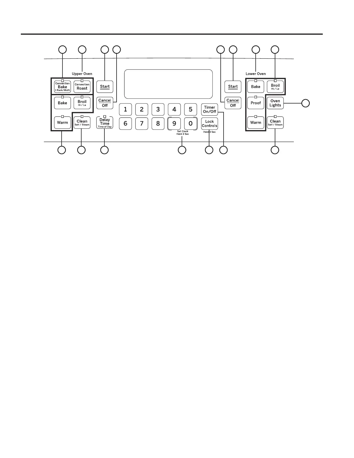 7. Clock: Sets the oven clock time. Press the 9 and 0