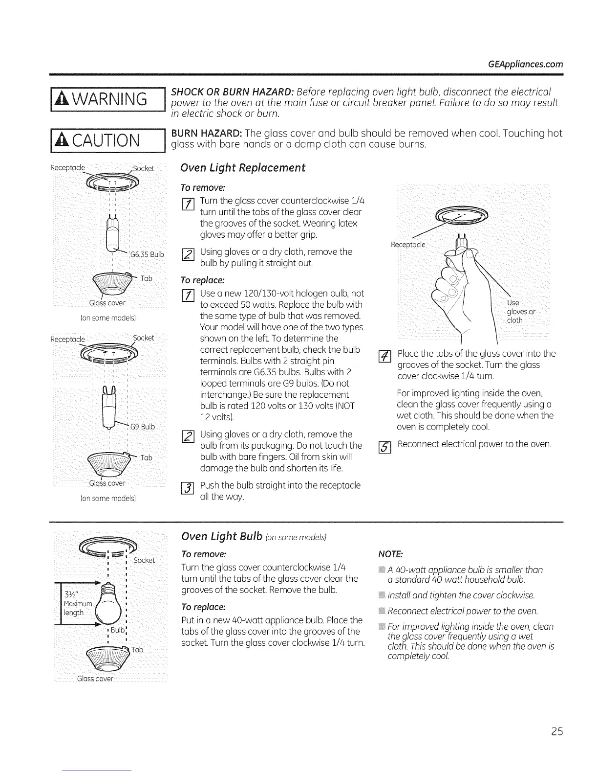 SHOCK OR BURN HAZARD: Before replacing oven light bulb, disconnect the electricalpower to the oven at the main fuse or circuit breaker panel. Failure to do so may result
