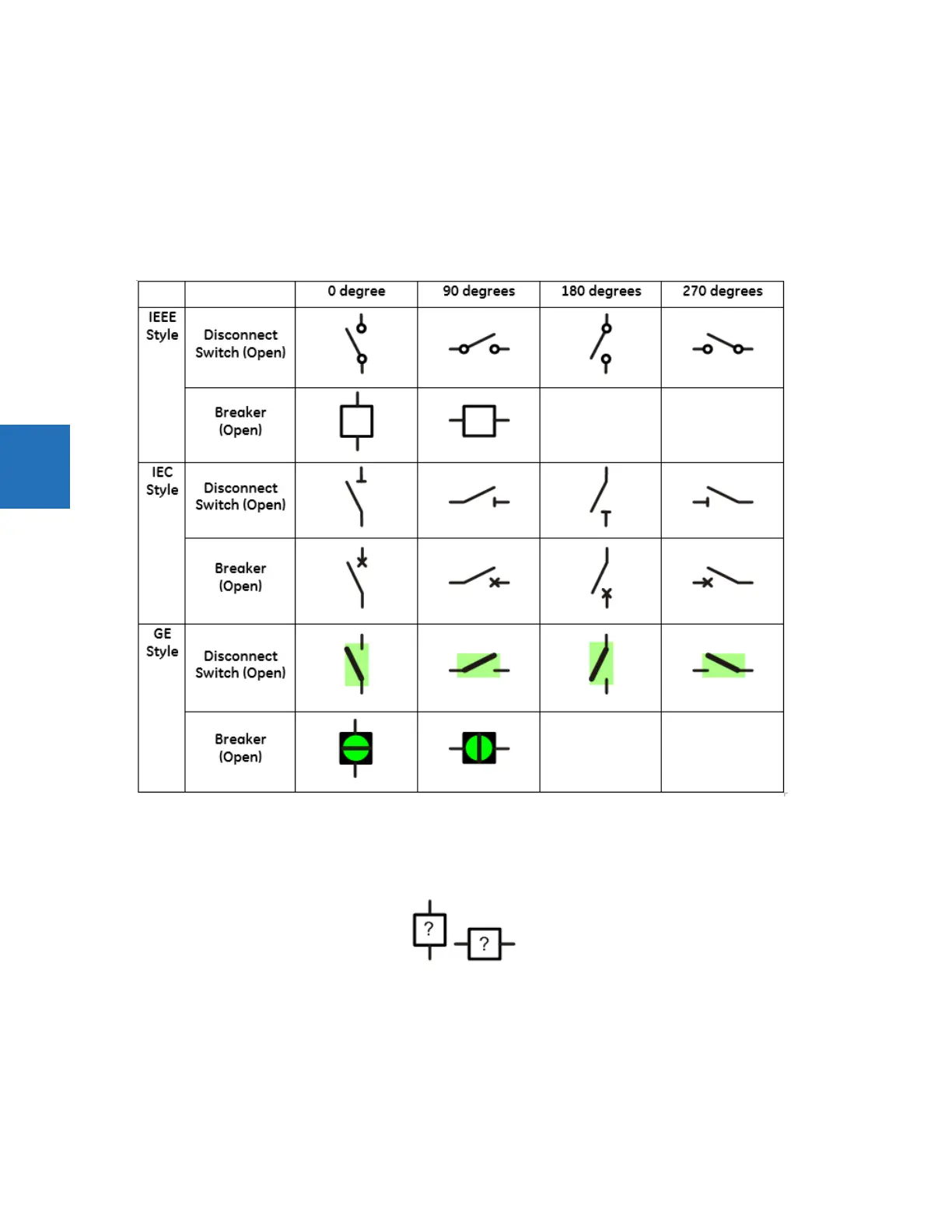 The figure shows the orientation available for the breaker and disconnect switch (taking Open status as examples). The