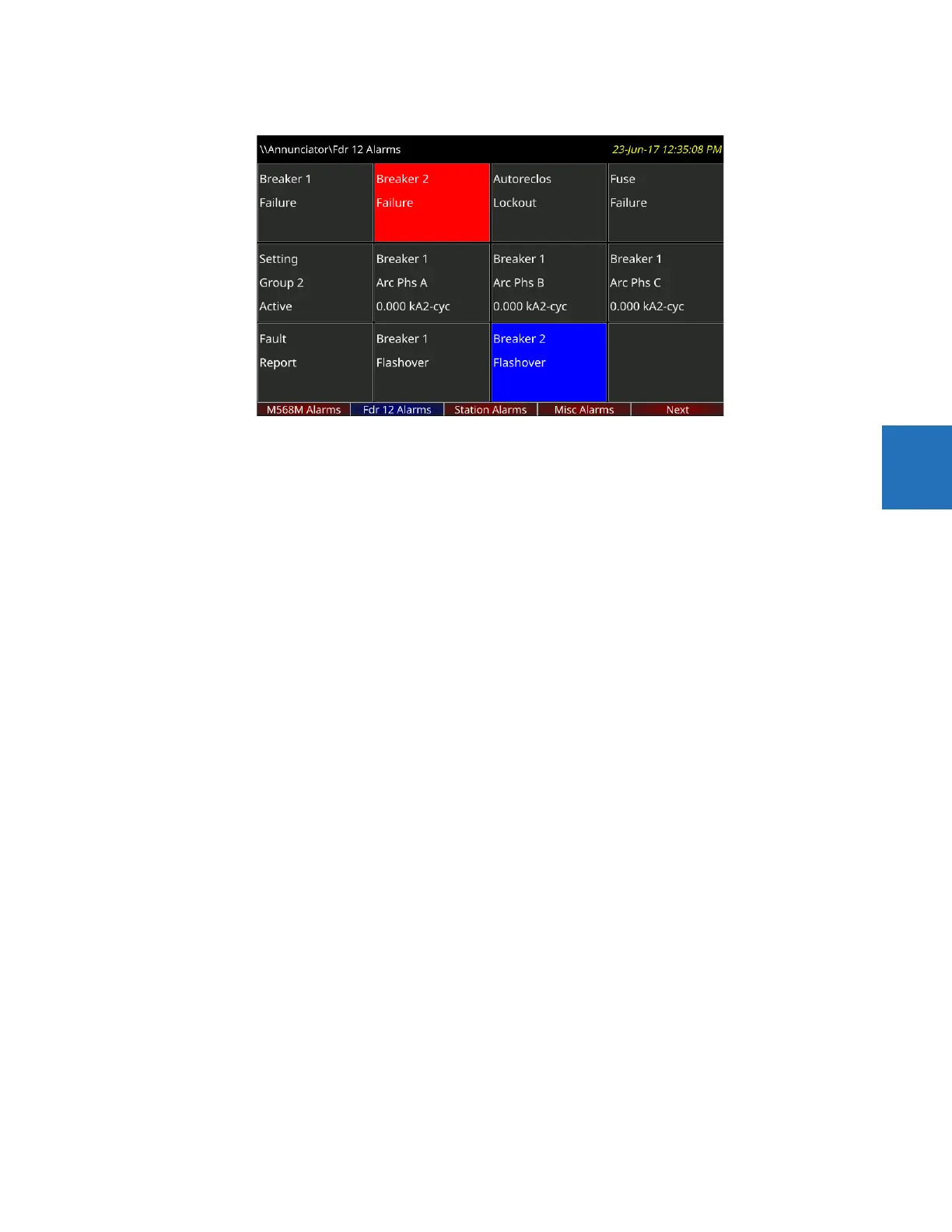 each annunciator page is configurable and displays in the header and Tab label. The current page has a blue Tab label.