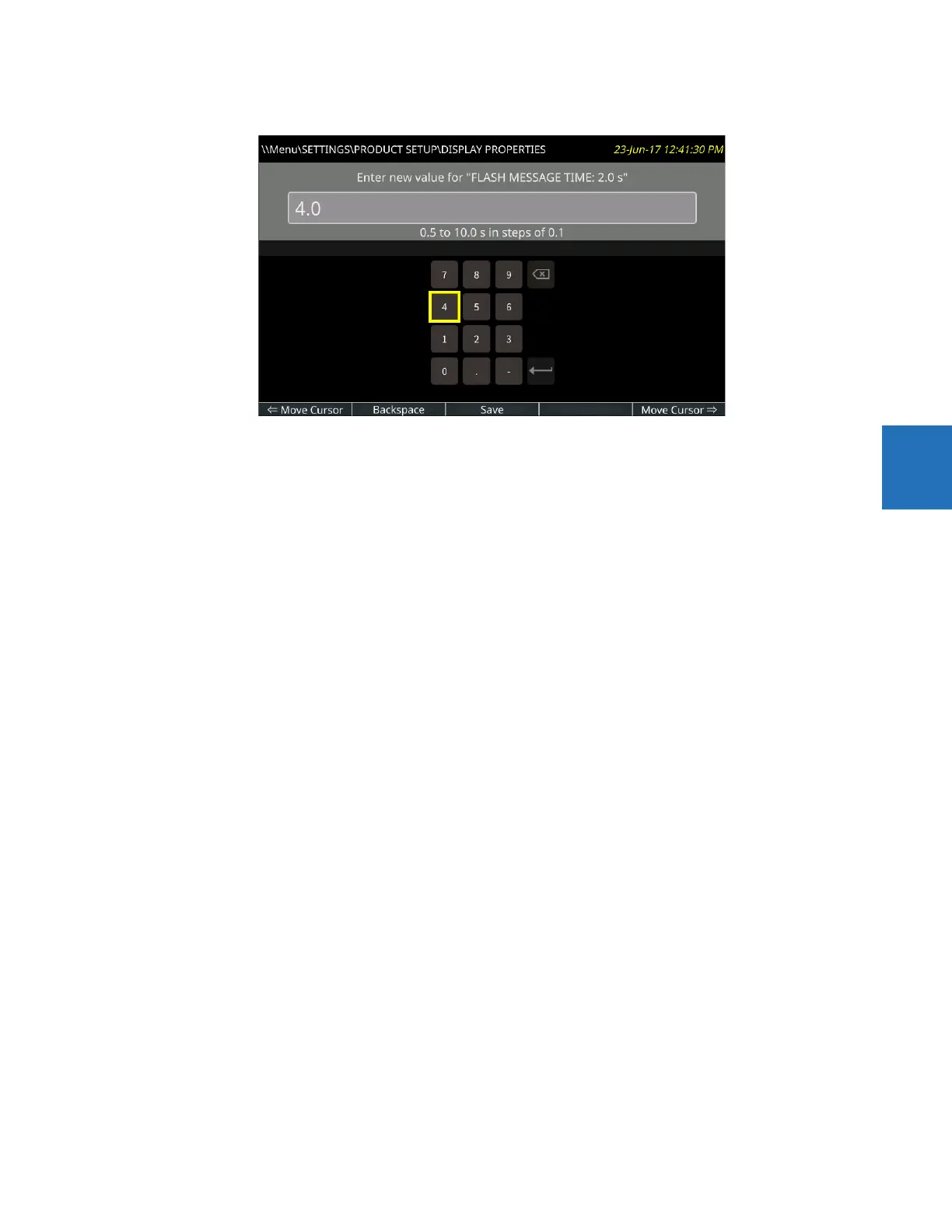 Using the arrow keys, enter another time, for example 4 for four seconds. These Up, Down, Left, and Right pushbuttons