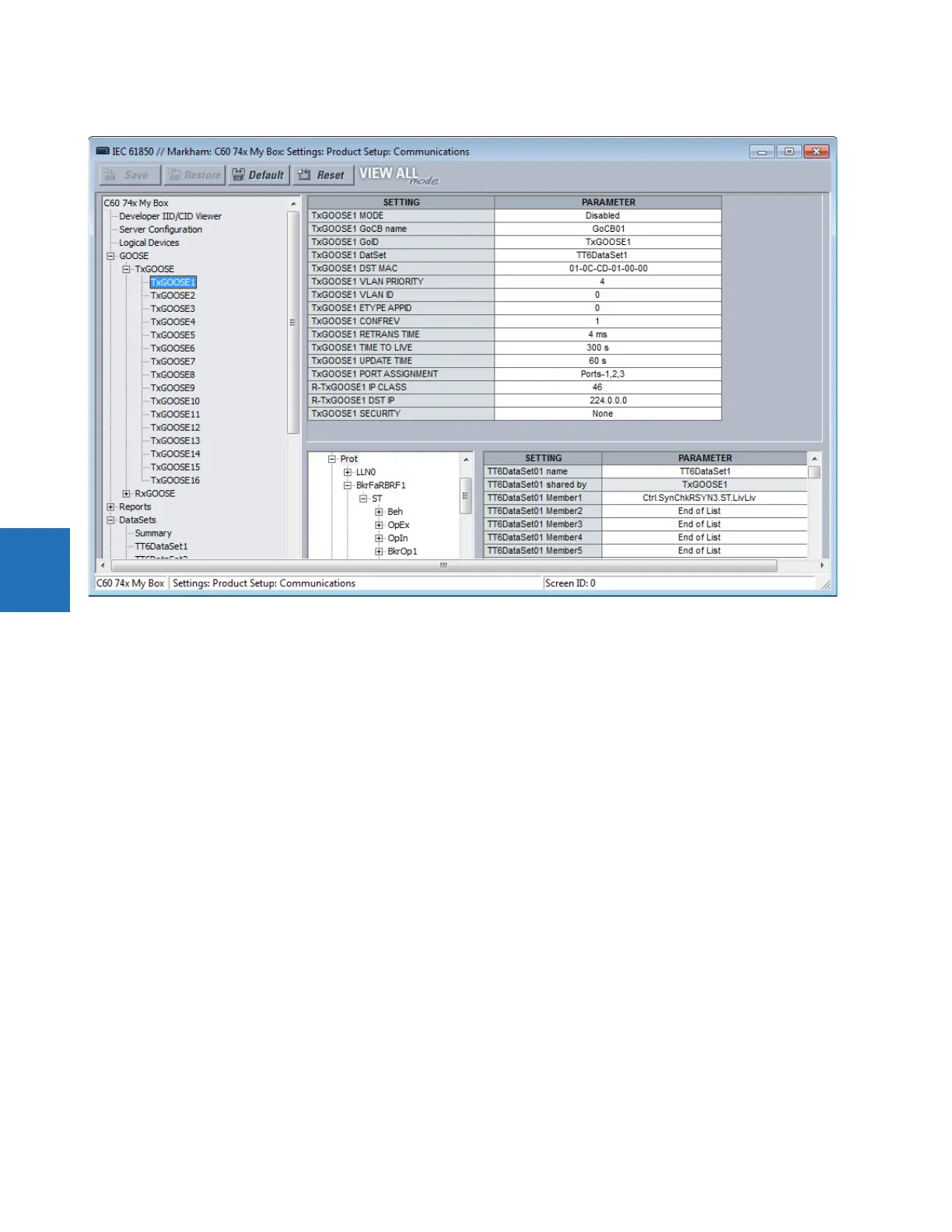 TxGOOSE1 DST MAC address is set to 00 00 00 00 00 00 and cannot be