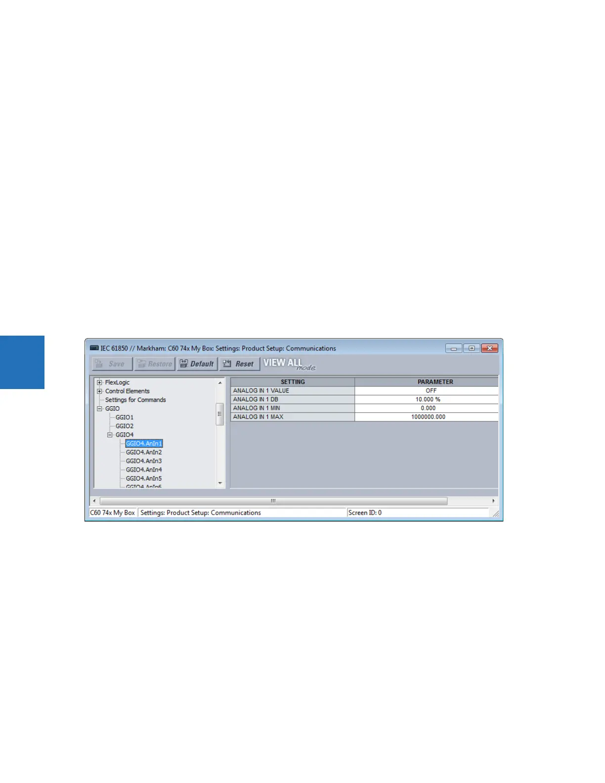 Navigate to Settings > Product Setup > Communications > IEC 61850 > GGIO > GGIO4 > GGIO4.AnIn1 to access the