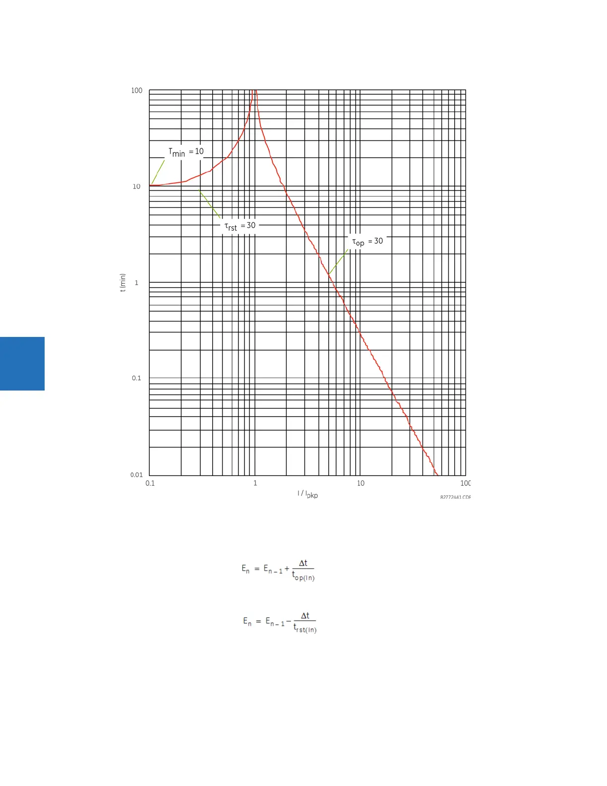 The thermal overload protection element estimates accumulated thermal energy E using the following equations