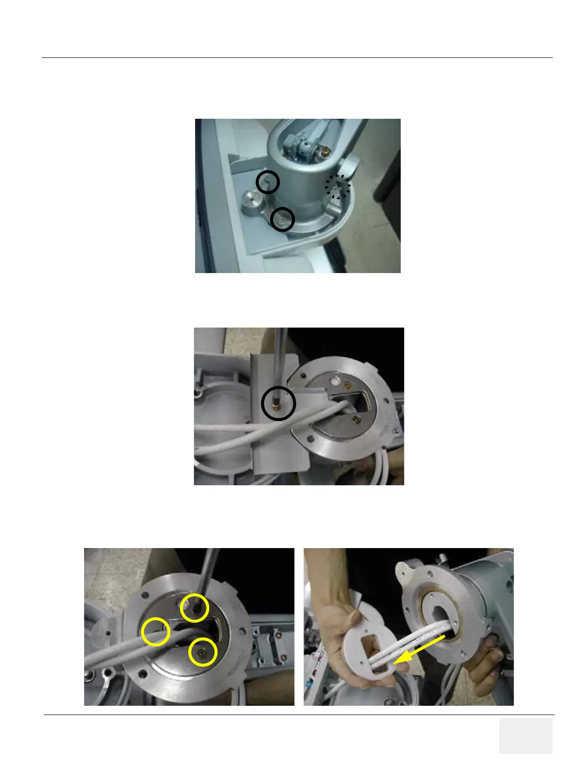 18.) Unscrew 3 screws (2373562, FH M4x10 YEL) to separate the Flexible arm stopper(A+B). Refer to