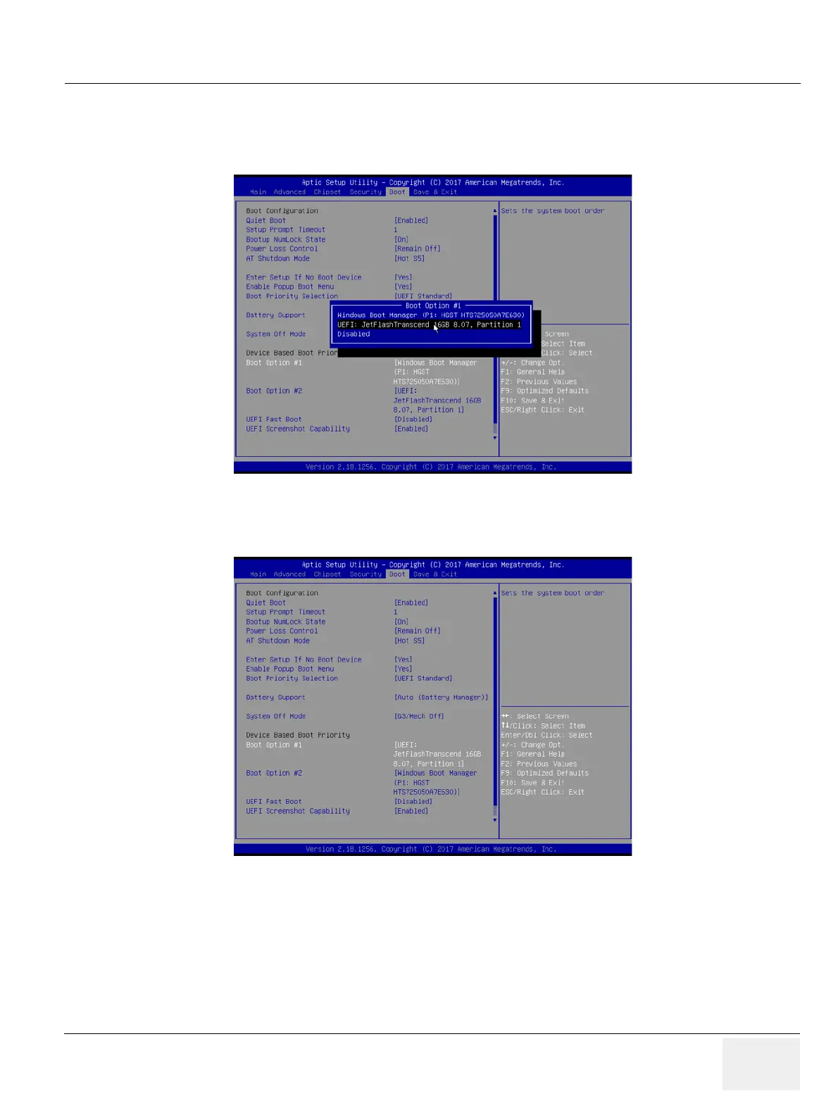 6.) In “Boot” page, Change “Boot Option #1” to USB memory which is inserted.