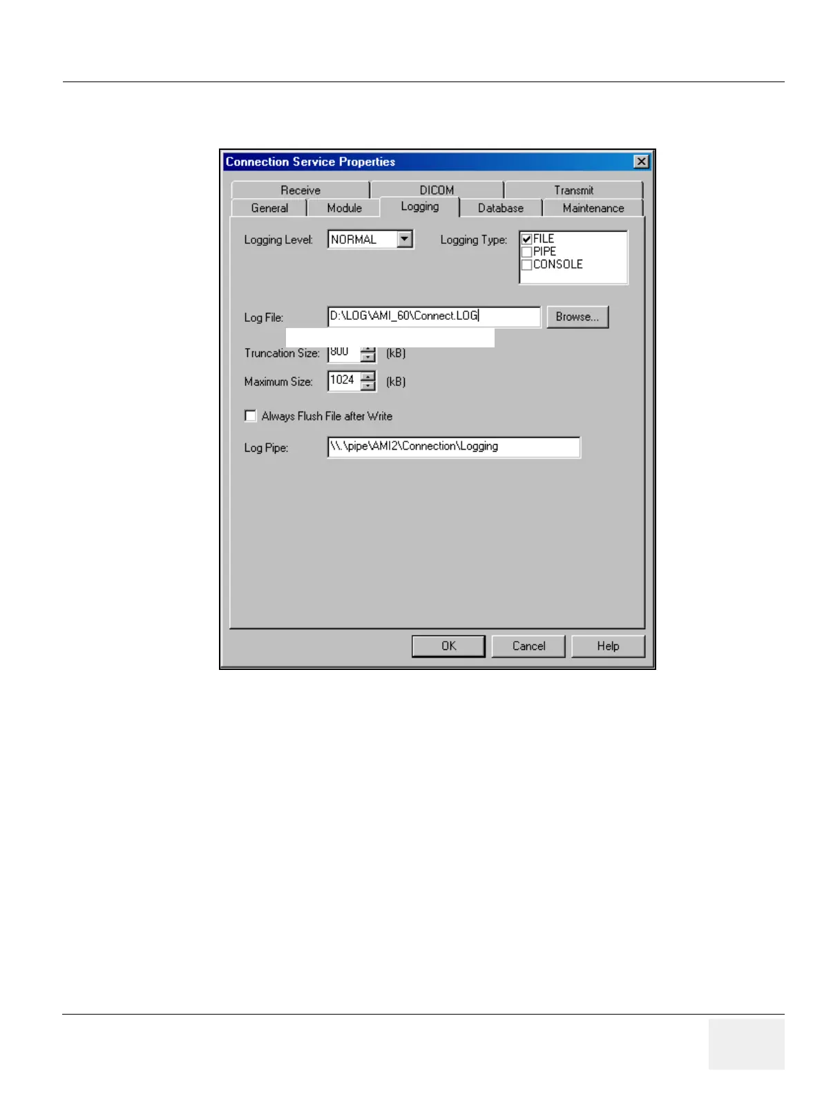 Figure 3-121 Connection Service Properties - Logging (Default Settings)