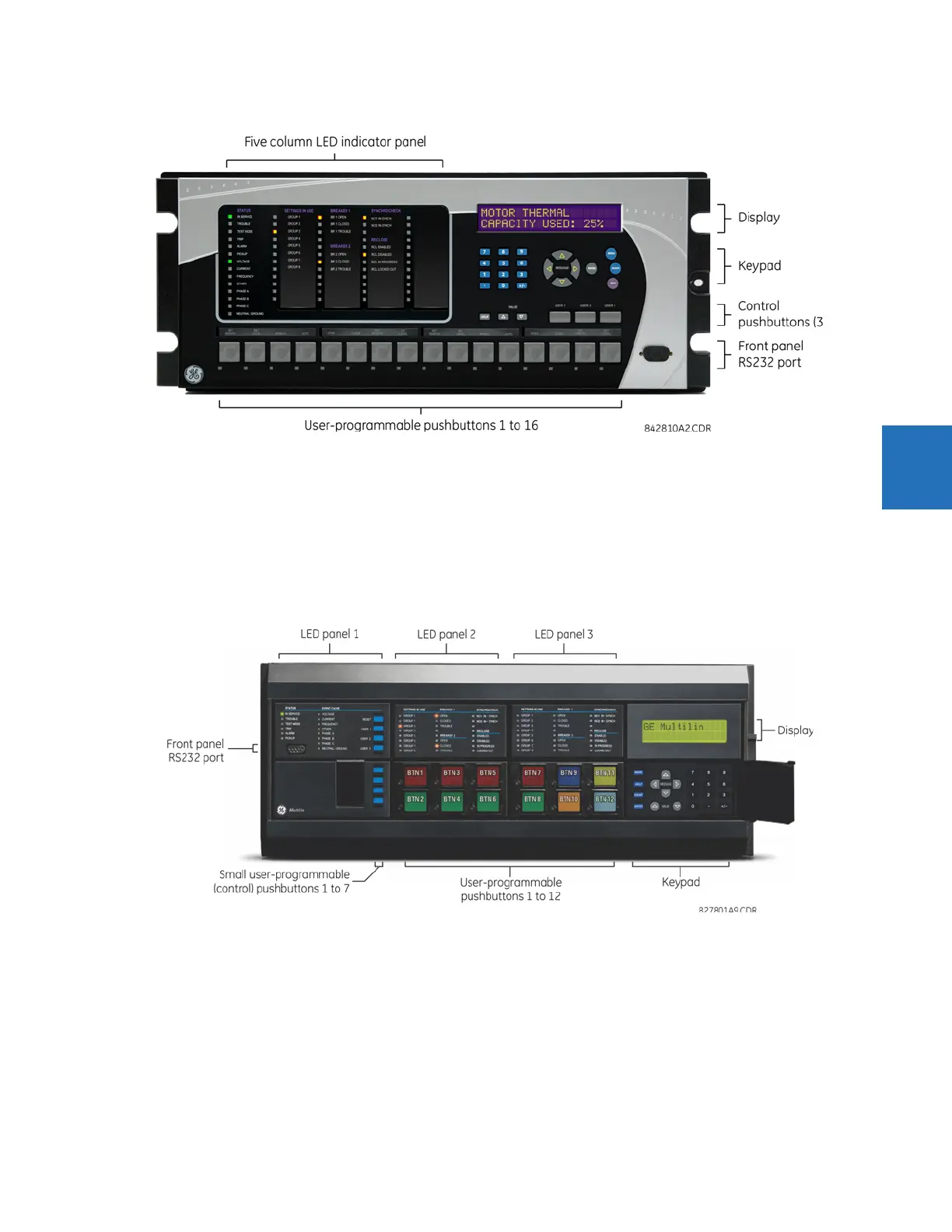The following figure shows the vertical front panel for relays ordered with the vertical option.