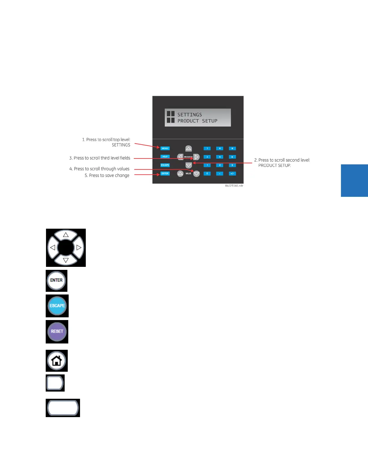 RESET — Clears all latched LED indications and target messages. When a page with acknowledgeable/resettable