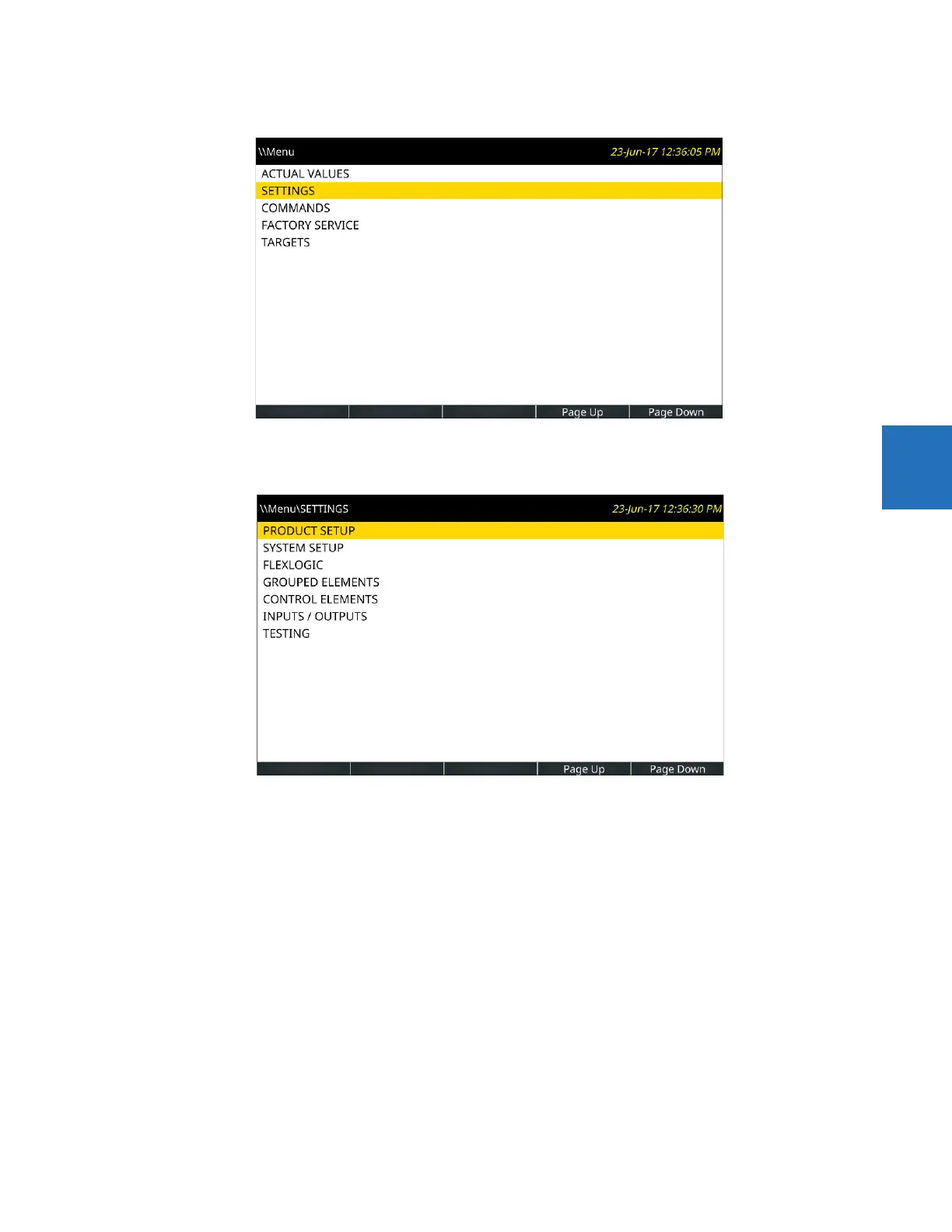 Use the Up or Down pushbutton to select SETTINGS, then press the Right or ENTER pushbutton.