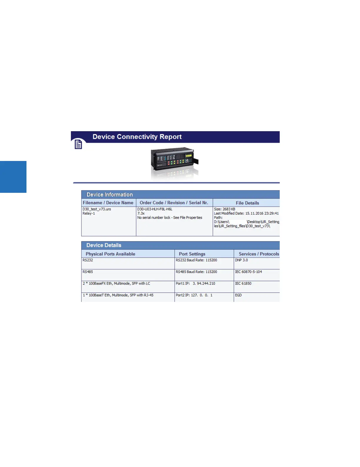 This report displays basic information about a device, such as order code, port numbers, inputs and outputs. You can use it