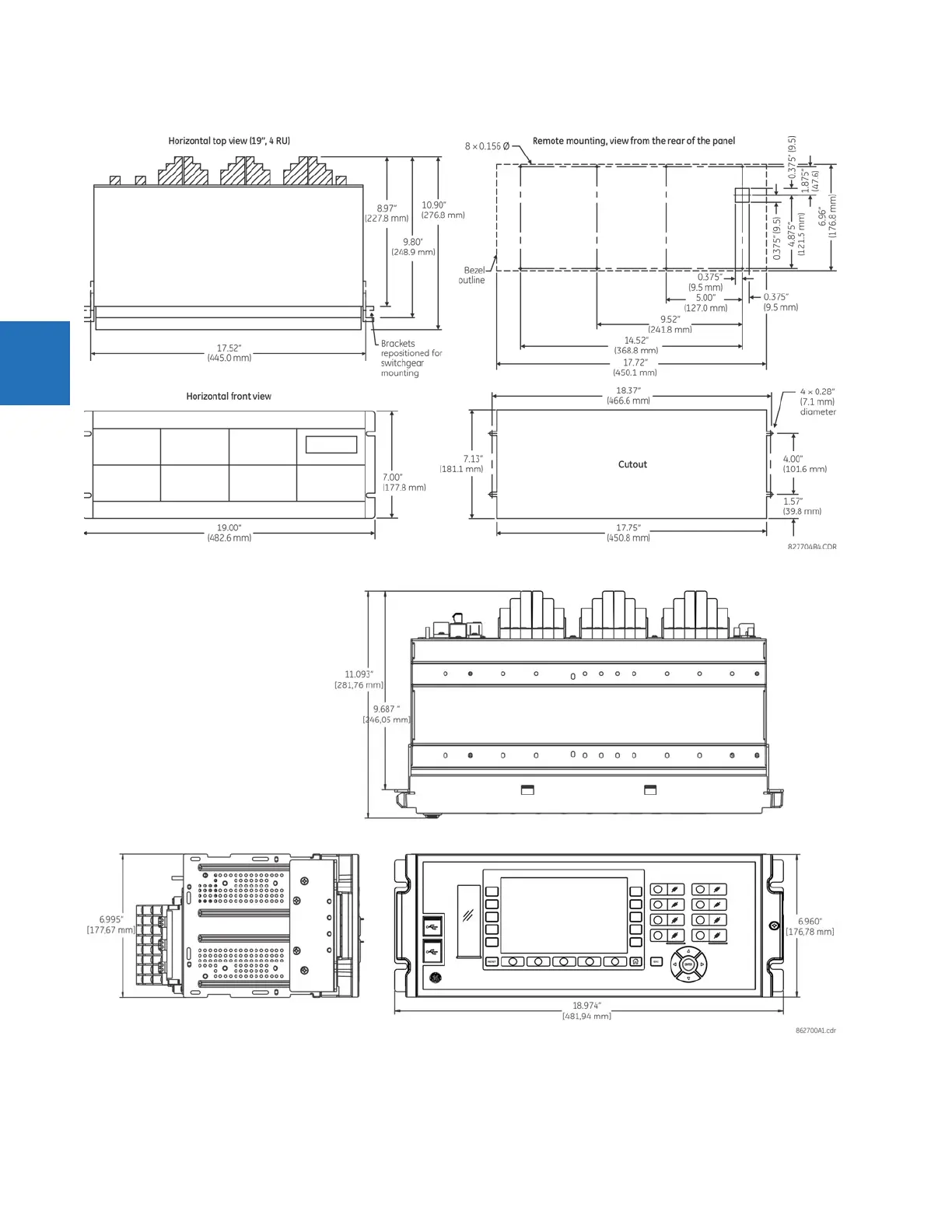 Figure 3-3: Horizontal mounting and dimensions (standard front panel)