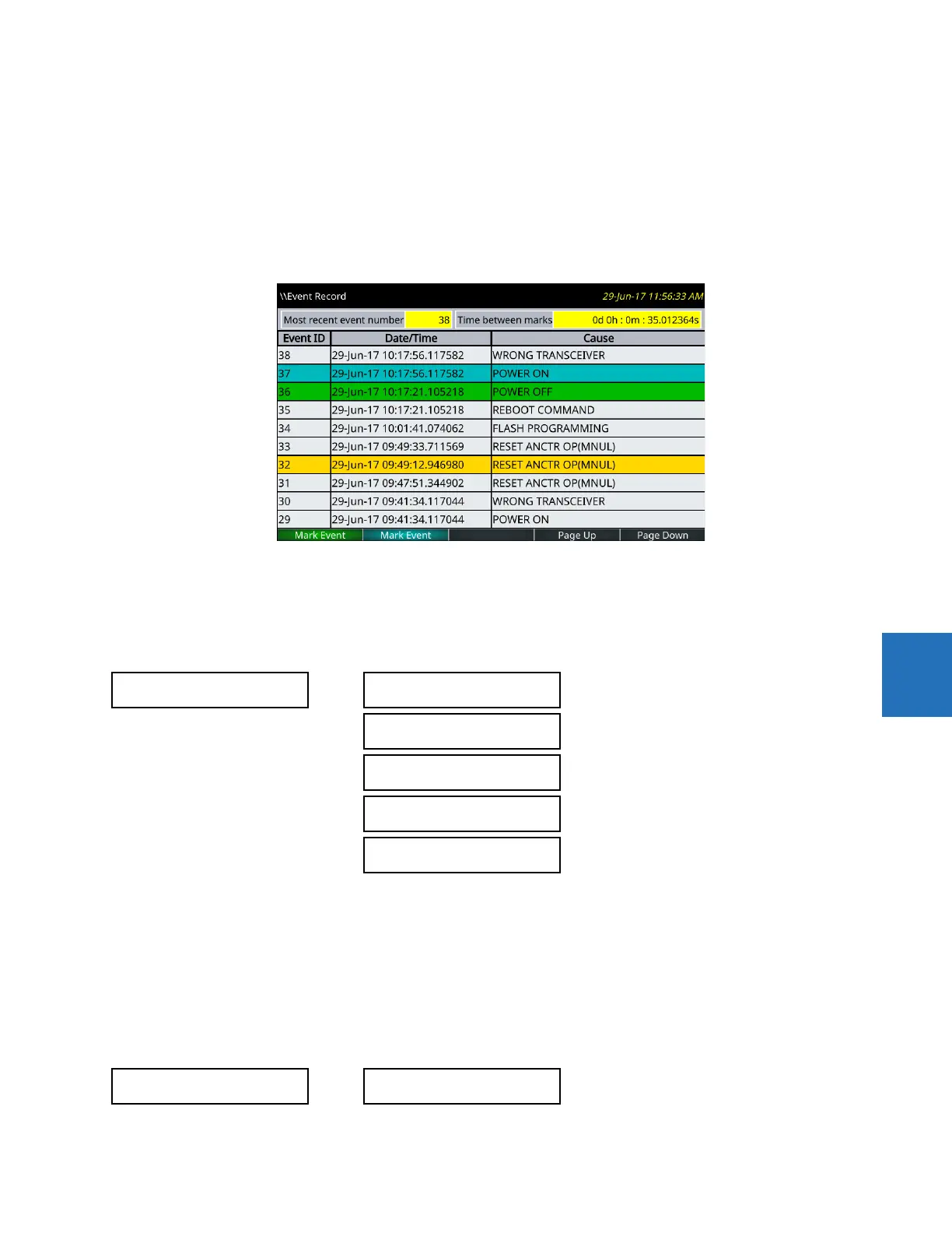 A selected event is highlighted in yellow and becomes active by pressing the Up or Down pushbutton.