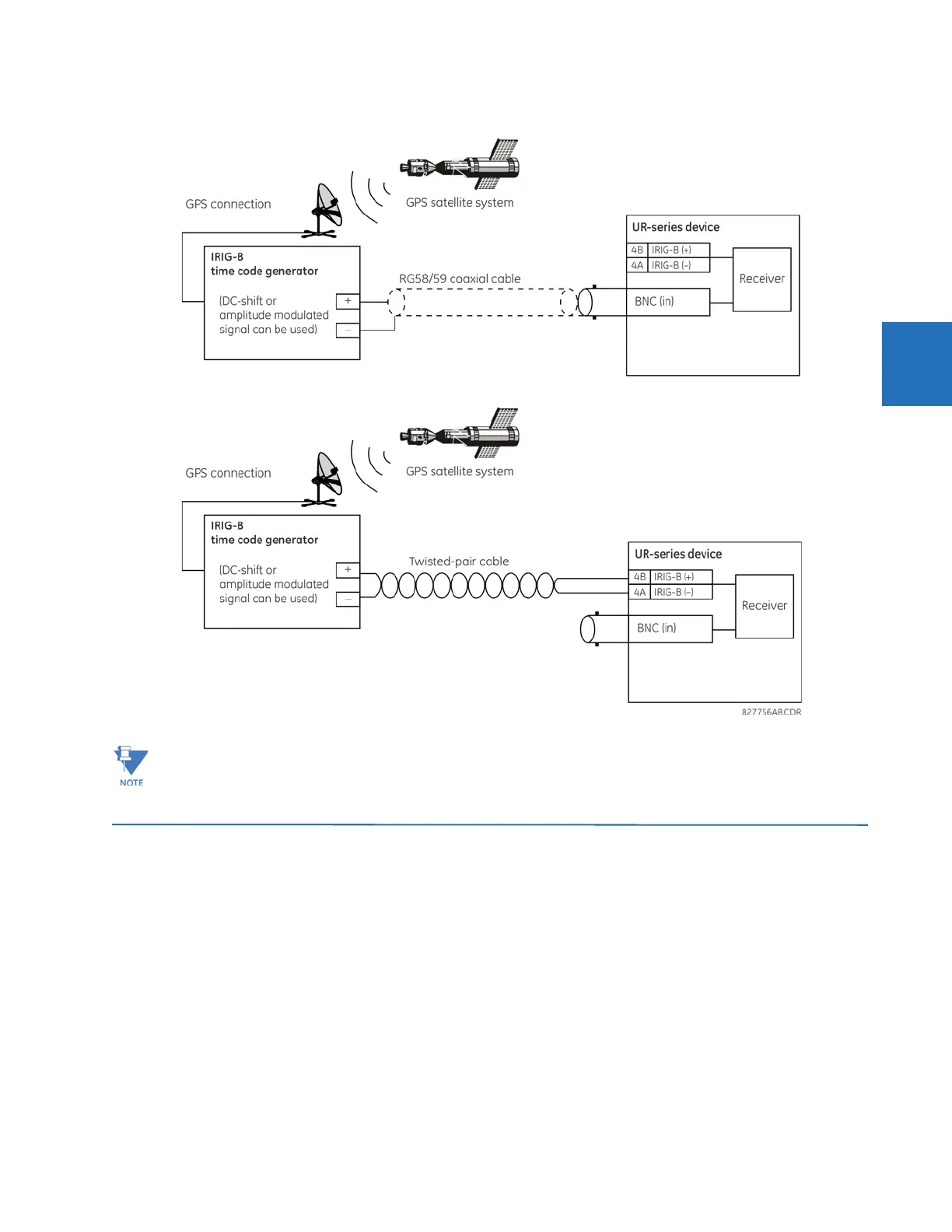 illustrates a ring of four UR-series relays with the following connections: UR1-Tx to UR2-Rx, UR2-Tx to UR3-Rx, UR3-Tx to