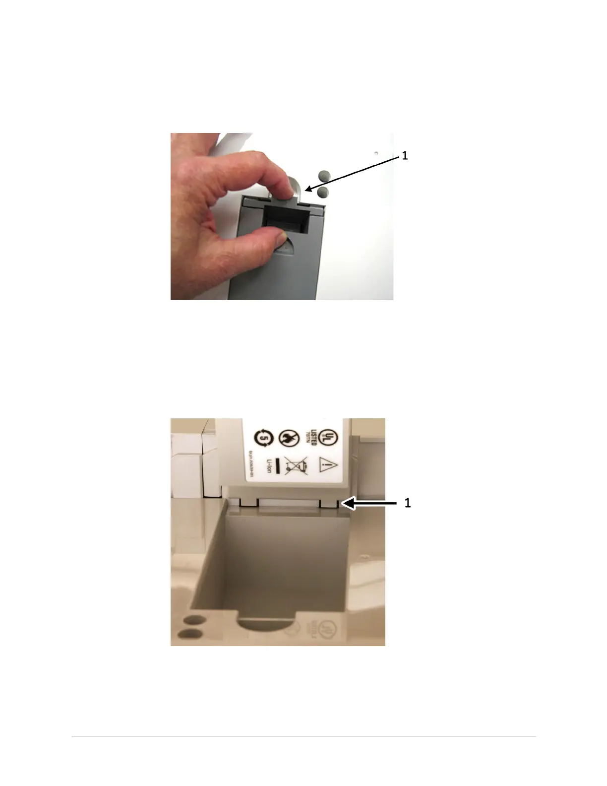 4.Pressthebatteryreleasetab(1)andraisethebatteryfromitscompartment
